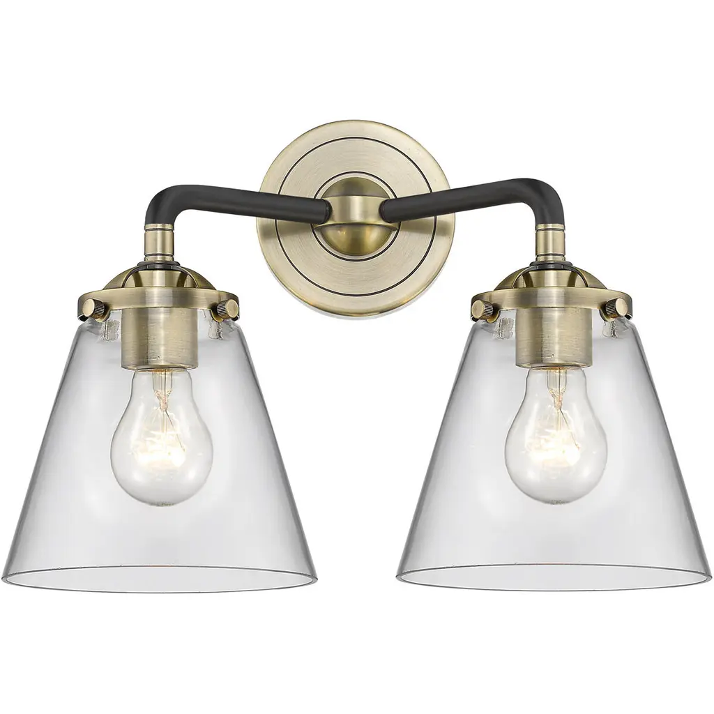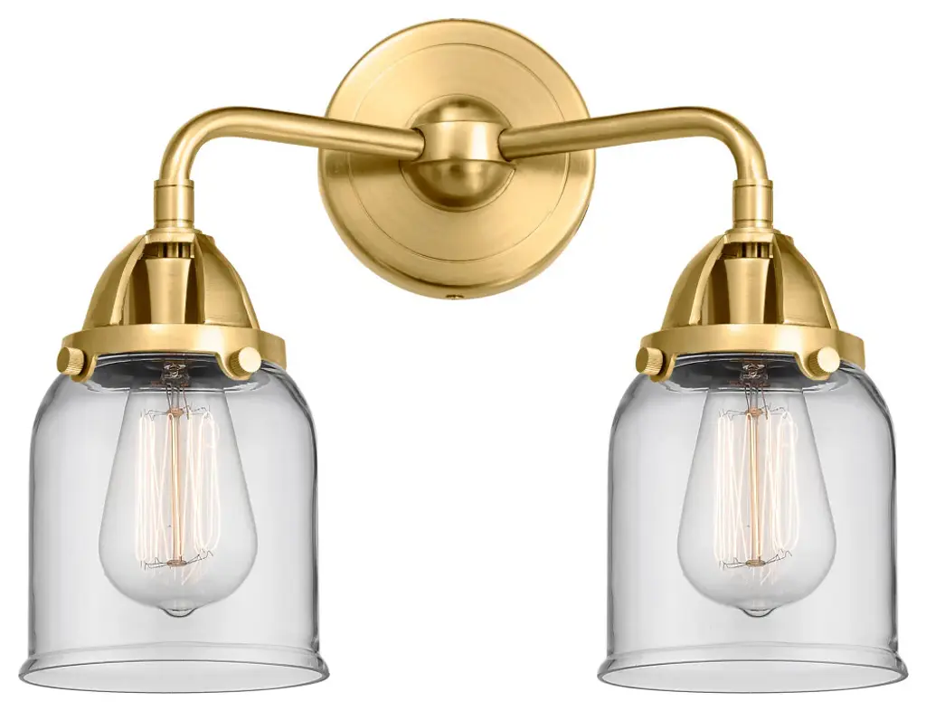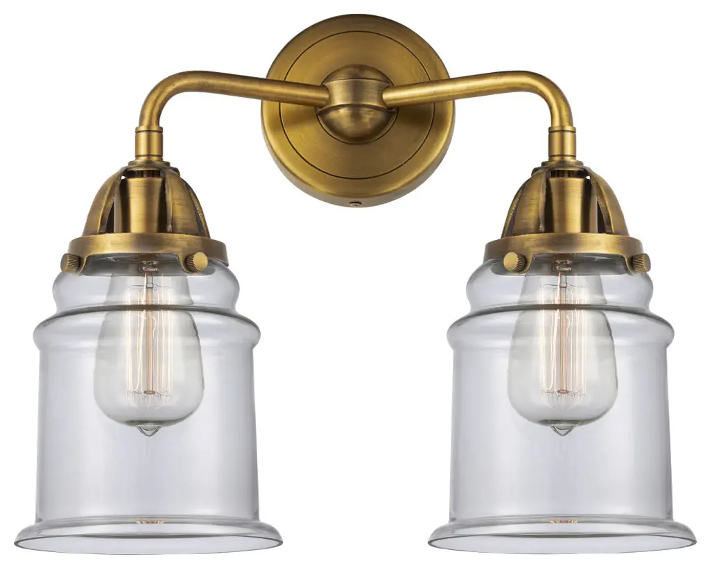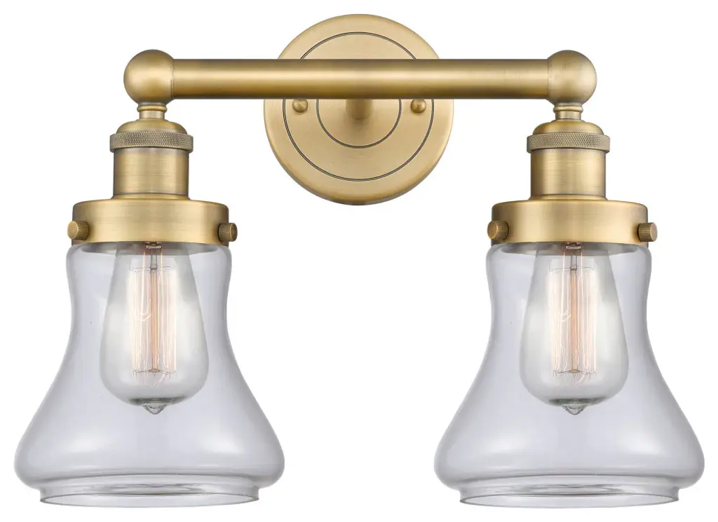 The Nouveau 2 is a highly detailed work of art that draws the eyes into its base and arm detail. The true show stopping piece is the beautifully curved glass shade that''s sure to wow you and guests alike.Features:Fixture can be hung with bulbs facing up or down4.5 inch 2mm heavy cast backplateDistance from outlet opening to top of fixture 2.25 inchesRated for 100 watt maximum per socketUL/CUL Damp RatedCompatible with Incandescent, LED, Fluorescent and Halogen bulbsNumber of Bulbs: 2Bulb Wattage: 3.5Bulb Type: LEDBulb Included: IncludedVoltage: 120Finish: Brushed Brass, Clear