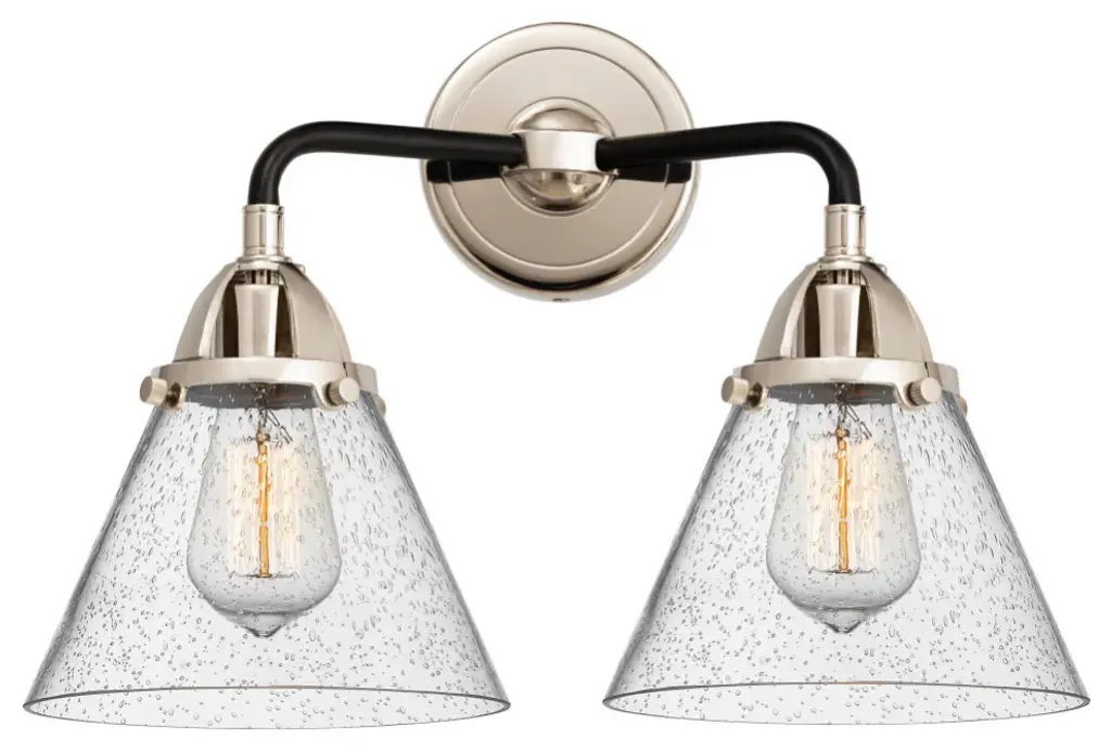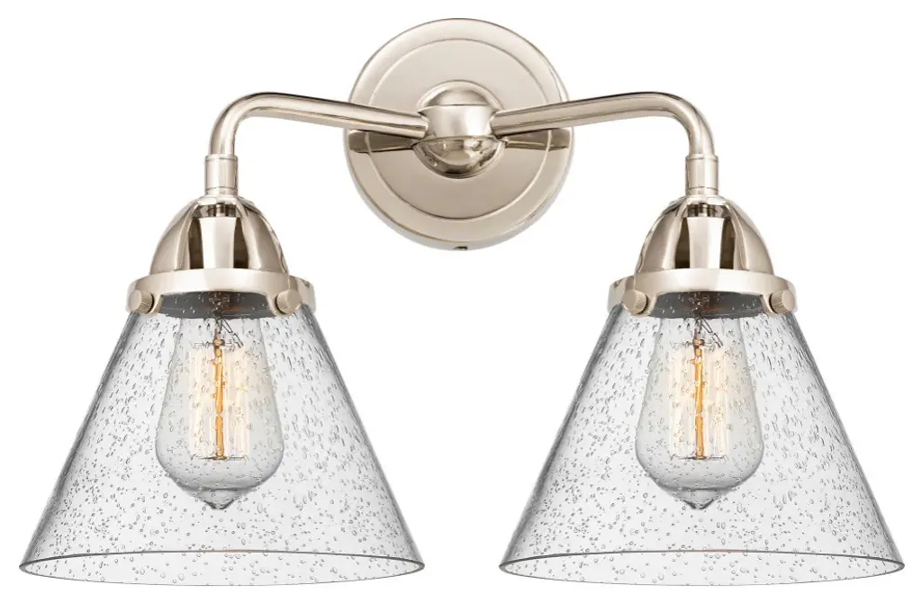 The Nouveau 2 is a highly detailed work of art that draws the eyes into its base and arm detail. The true show stopping piece is the beautifully curved glass shade that''s sure to wow you and guests alike.Features:Fixture can be hung with bulbs facing up or down4.5 inch 2mm heavy cast backplateDistance from outlet opening to top of fixture 2.25 inchesRated for 100 watt maximum per socketUL/CUL Damp RatedCompatible with Incandescent, LED, Fluorescent and Halogen bulbsNumber of Bulbs: 2Bulb Wattage: 60Bulb Type: IncandescentBulb Included: Not IncludedVoltage: 120Finish: Brushed Satin Nickel, Seedy