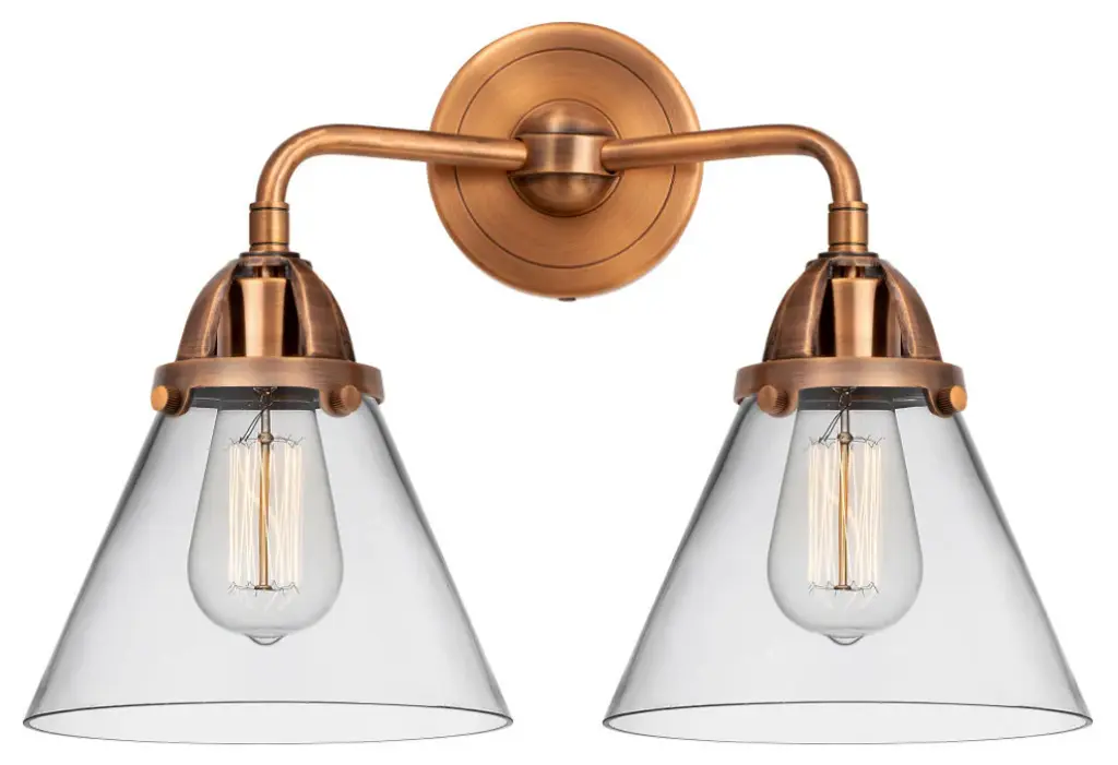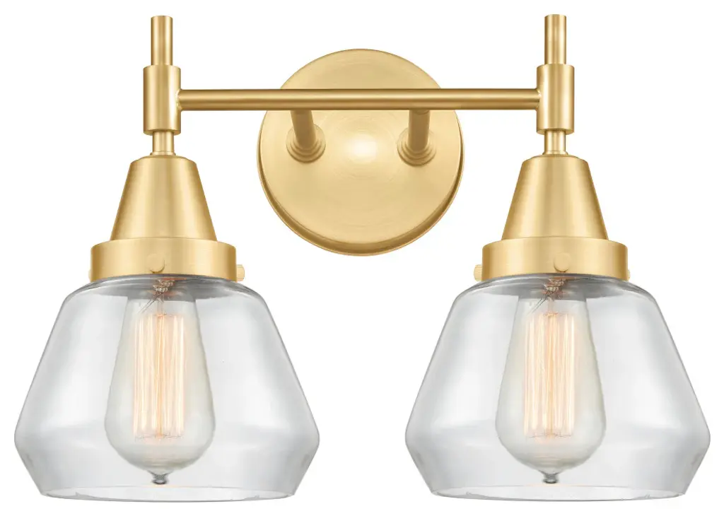 The Nouveau 2 is a highly detailed work of art that draws the eyes into its base and arm detail. The true show stopping piece is the beautifully curved glass shade that''s sure to wow you and guests alike.Features:Fixture can be hung with bulbs facing up or down4.5 inch 2mm heavy cast backplateDistance from outlet opening to top of fixture 2.25 inchesRated for 100 watt maximum per socketUL/CUL Damp RatedCompatible with Incandescent, LED, Fluorescent and Halogen bulbsNumber of Bulbs: 2Bulb Wattage: 60Bulb Type: IncandescentBulb Included: Not IncludedVoltage: 120Finish: Satin Gold, Clear