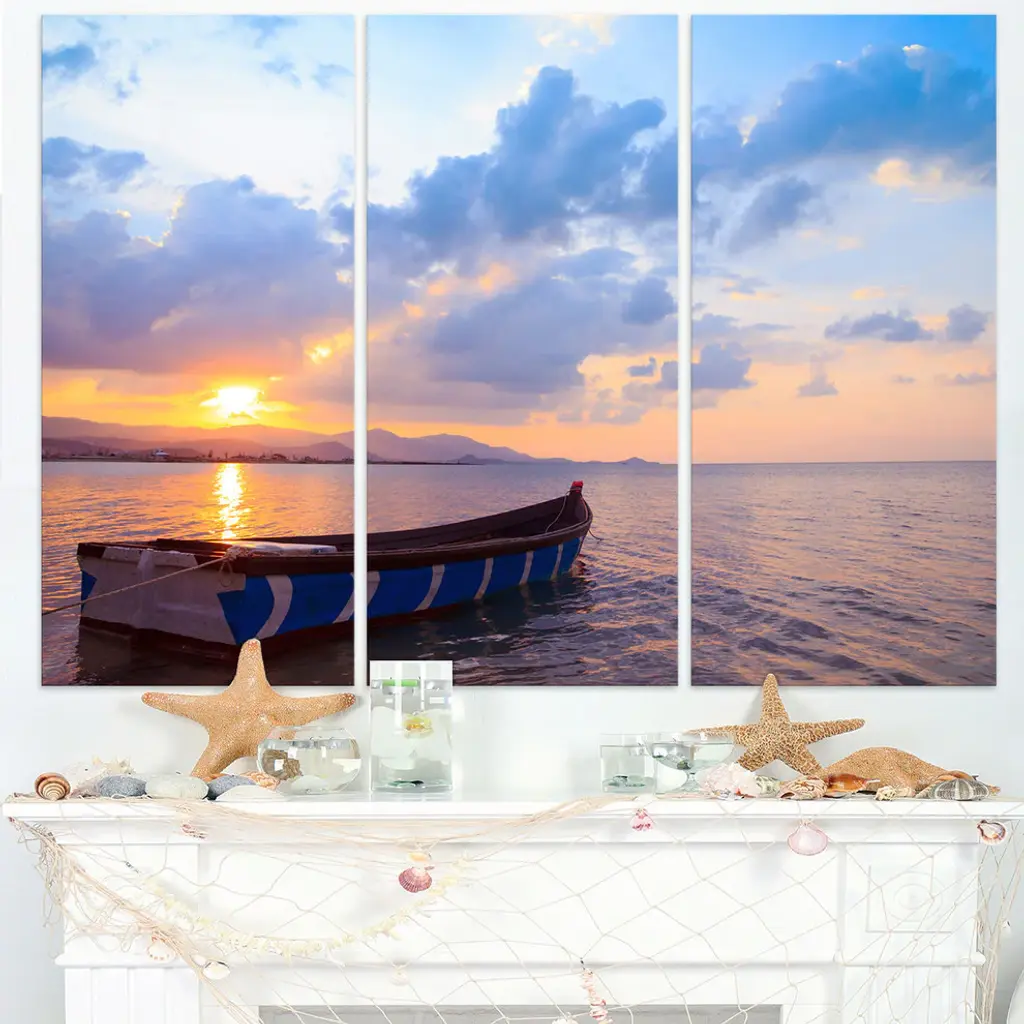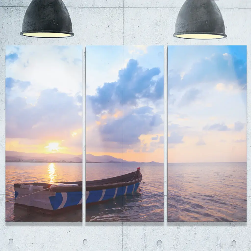 "Small Fishermen Boat At Sunset" Metal Wall Art, 3 Panels, 36"x28"