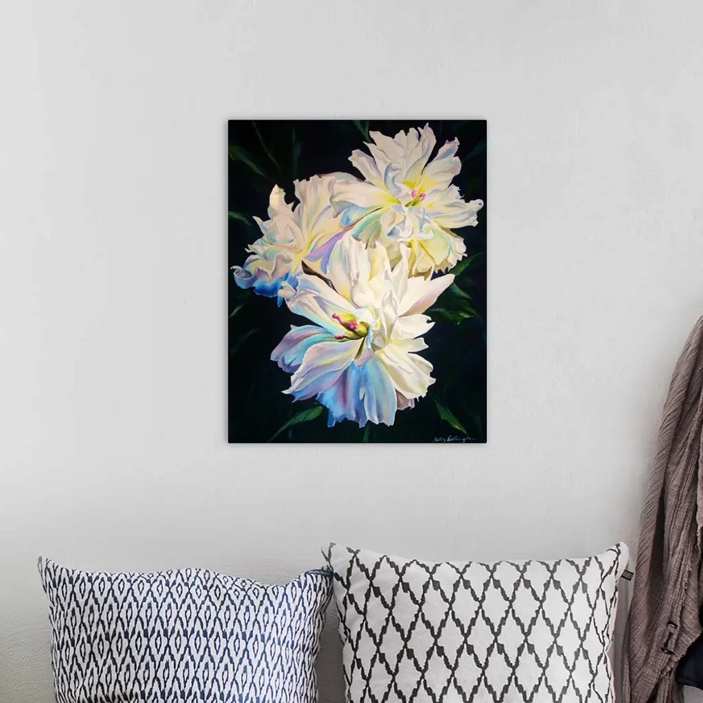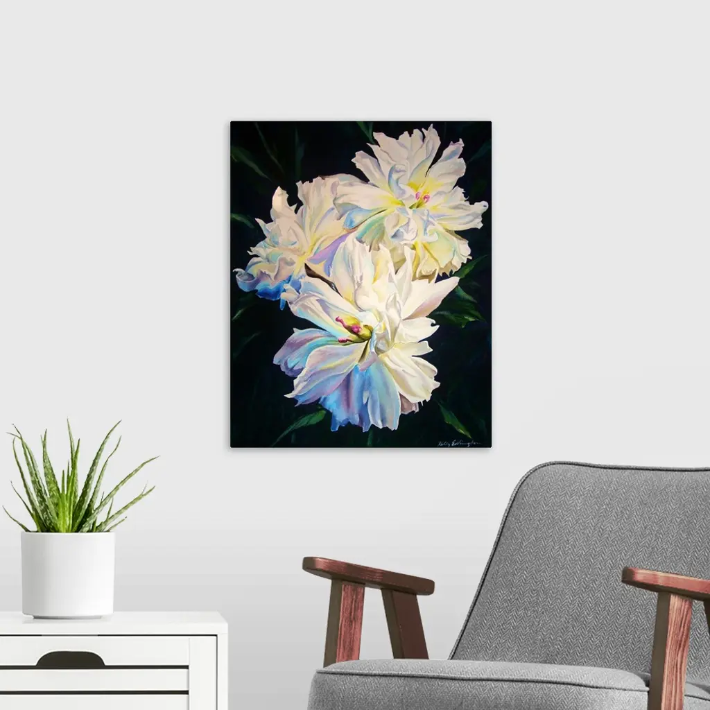 Vertical contemporary watercolor painting of white peonies in bloom.