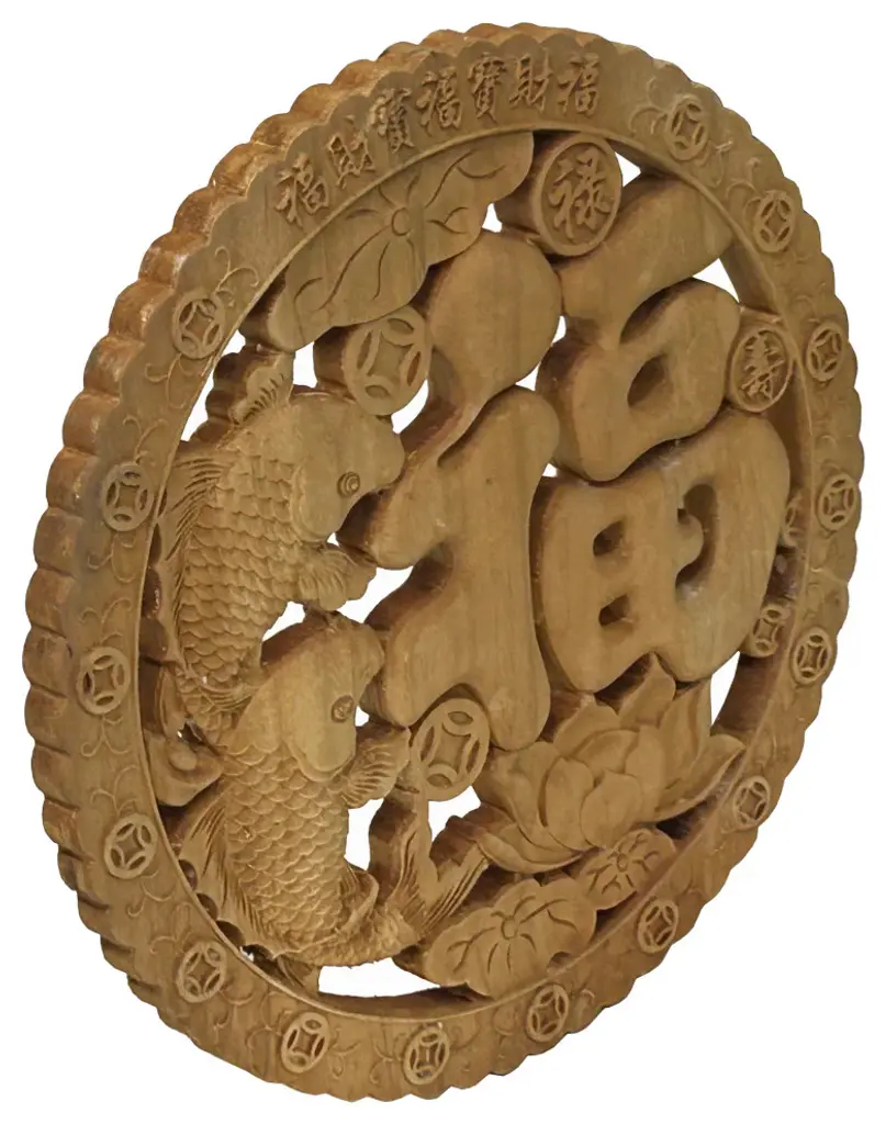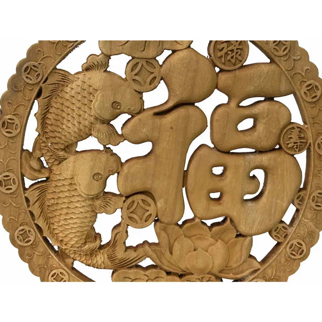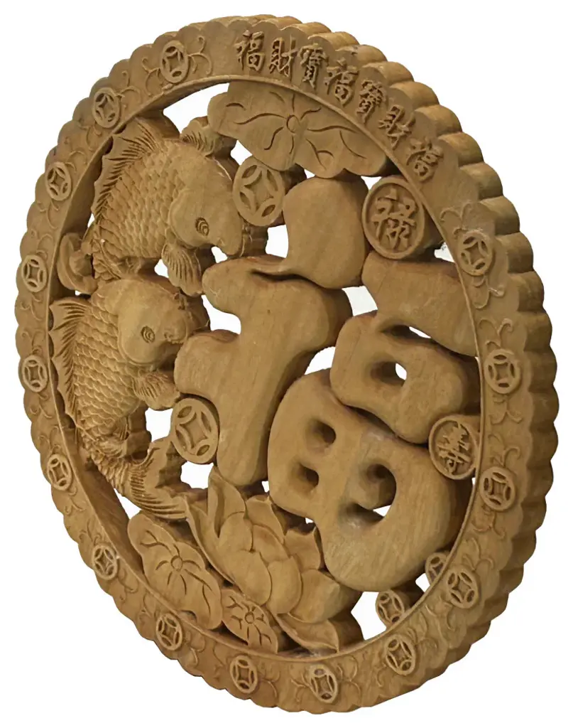 Small Round Wave Edge Fok Fish Lotus Coin Motif Wood Wall Panel Plaque Hws3608