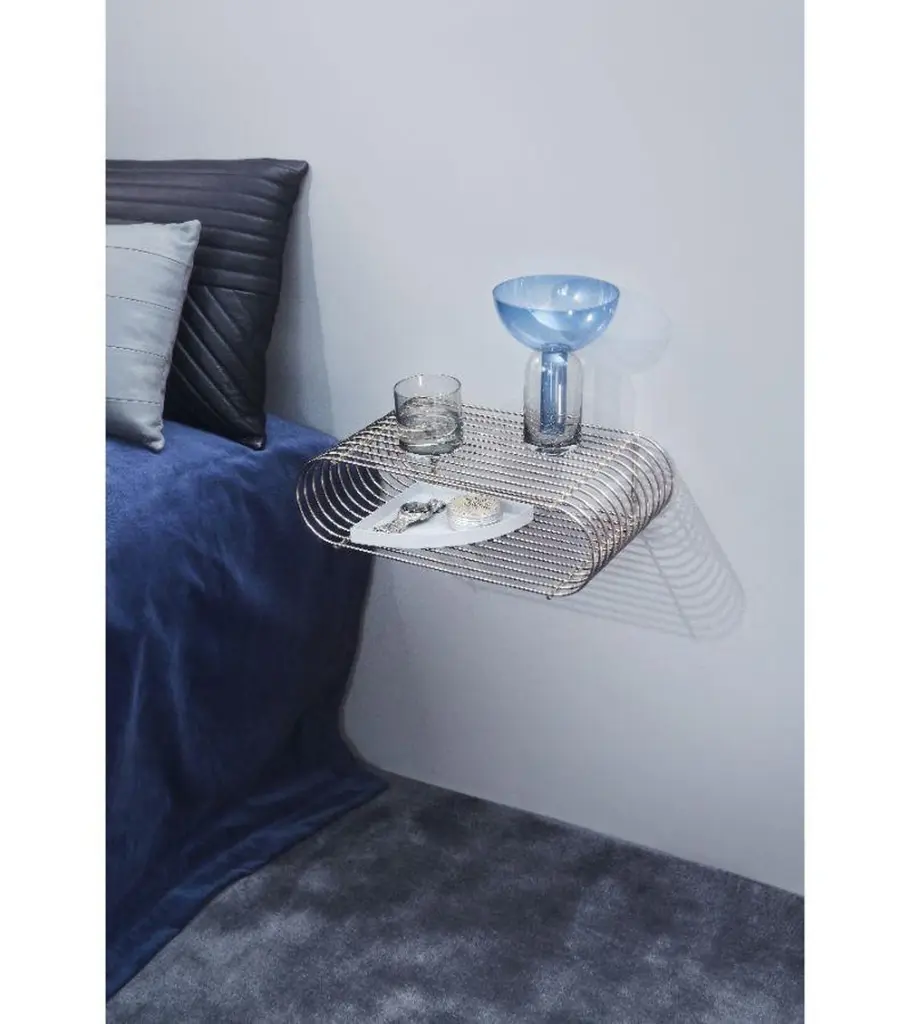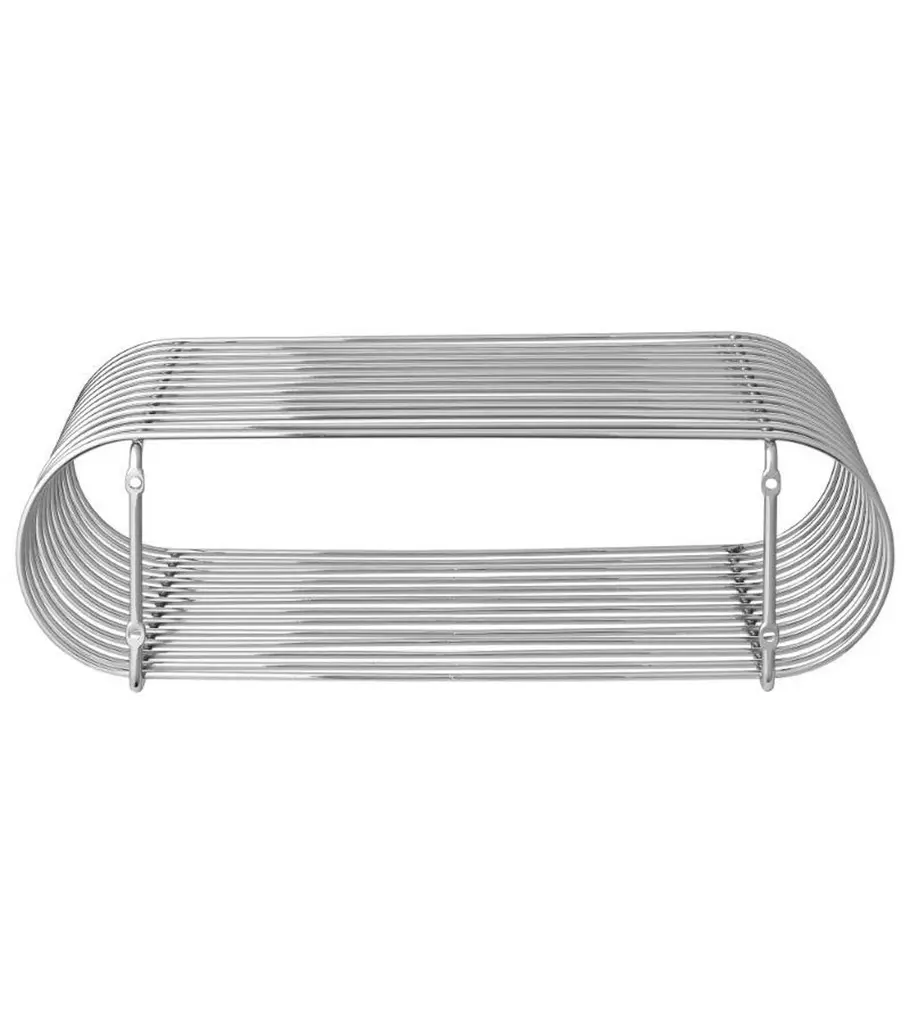 Small silver Contemporary shelfDimensions: L 40.4 x W 25.3 x H 12 cm Materials: Steel.Also available in black and gold.It is not always easy to determine what makes a design become an icon, but it seems the Curva shelf has accomplished just that. It's perfect as a bedside table or as an art piece on an empty wall. The shape and material are what we believe make this an icon that now comes in three distinct colors, stainless steel, black, and gold.