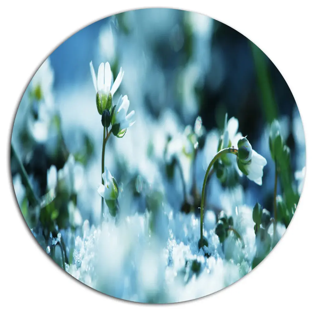 Bring Contemporary Abstraction to your home with this large Circle Metal wall art. This Small White Flowers on Blue Background Metal Artwork makes it the focal point of any room or office. - White Gloss Coating ensures colors are extra vibrant with light reflection.- Aluminum grade Sheet Metal with 1 inch mounting frame on the back giving the illusion that the artwork is floating on the wall..- Mounting Brackets are included along with instructions.- High Quality Digital images are created directly into a glossy aluminum panel producing a stunning and captivating print into the glossy finish of the metal.- Water, Fire and Scratch resistant HD Aluminum panels.- Looks better than any photo paper and guaranteed to last at least 20 years- Easy to clean with a microfiber cloth. Colors are far superior to regular Canvas Art. - Easy to Hang