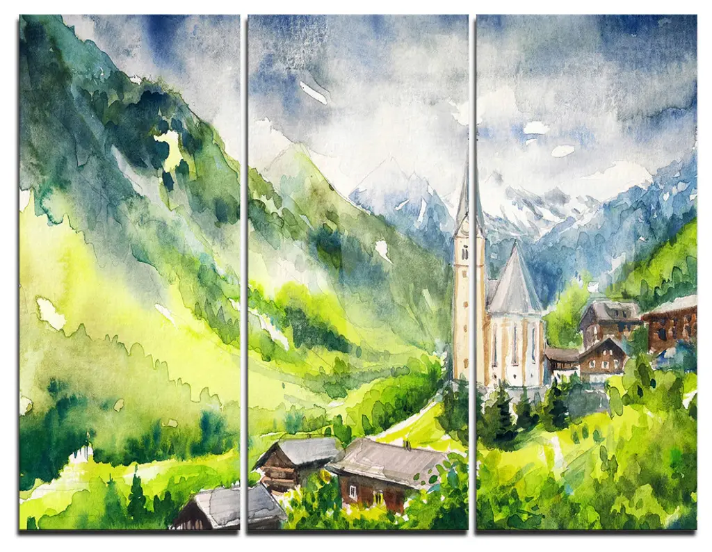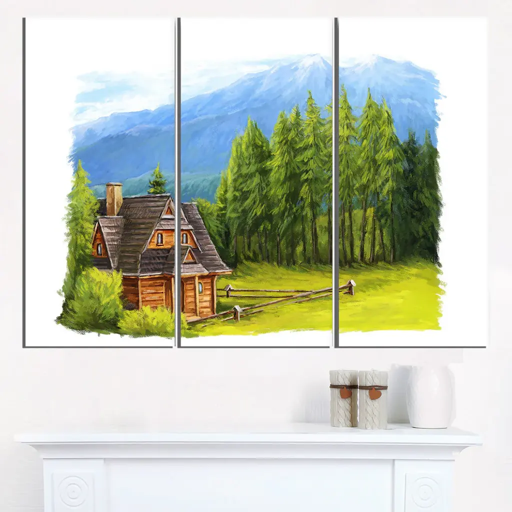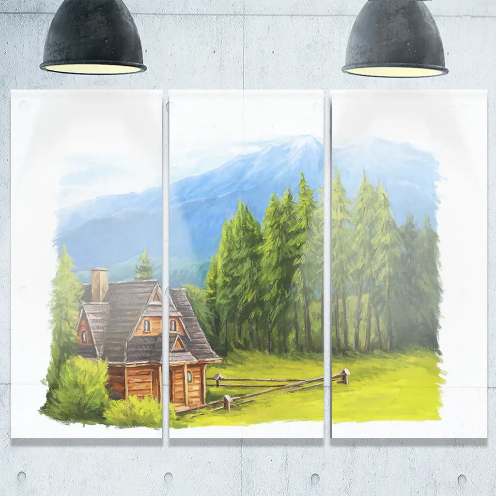 "Small Wooden Home In Mountains" Metal Wall Art, 3 Panels, 36"x28"