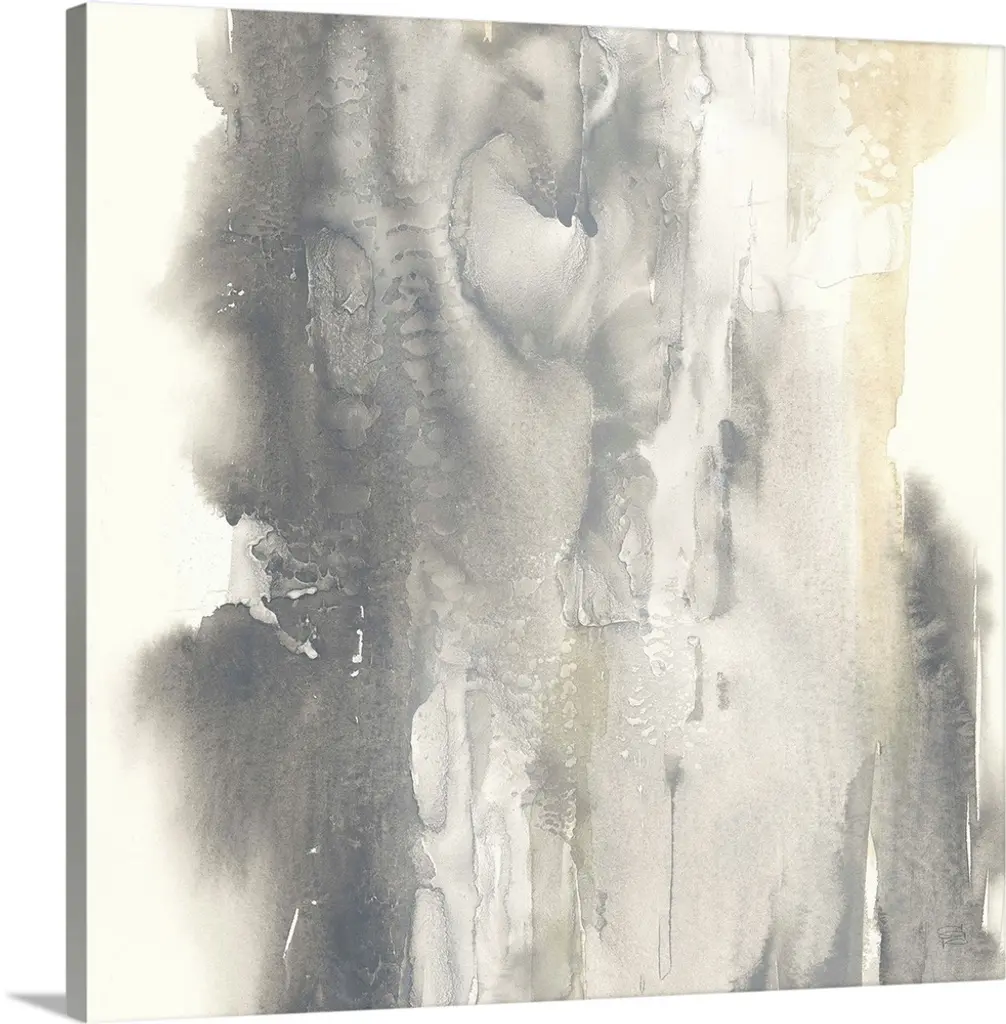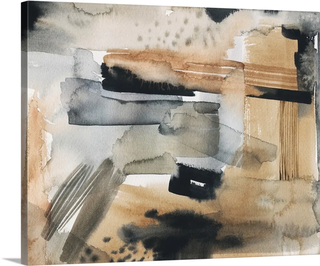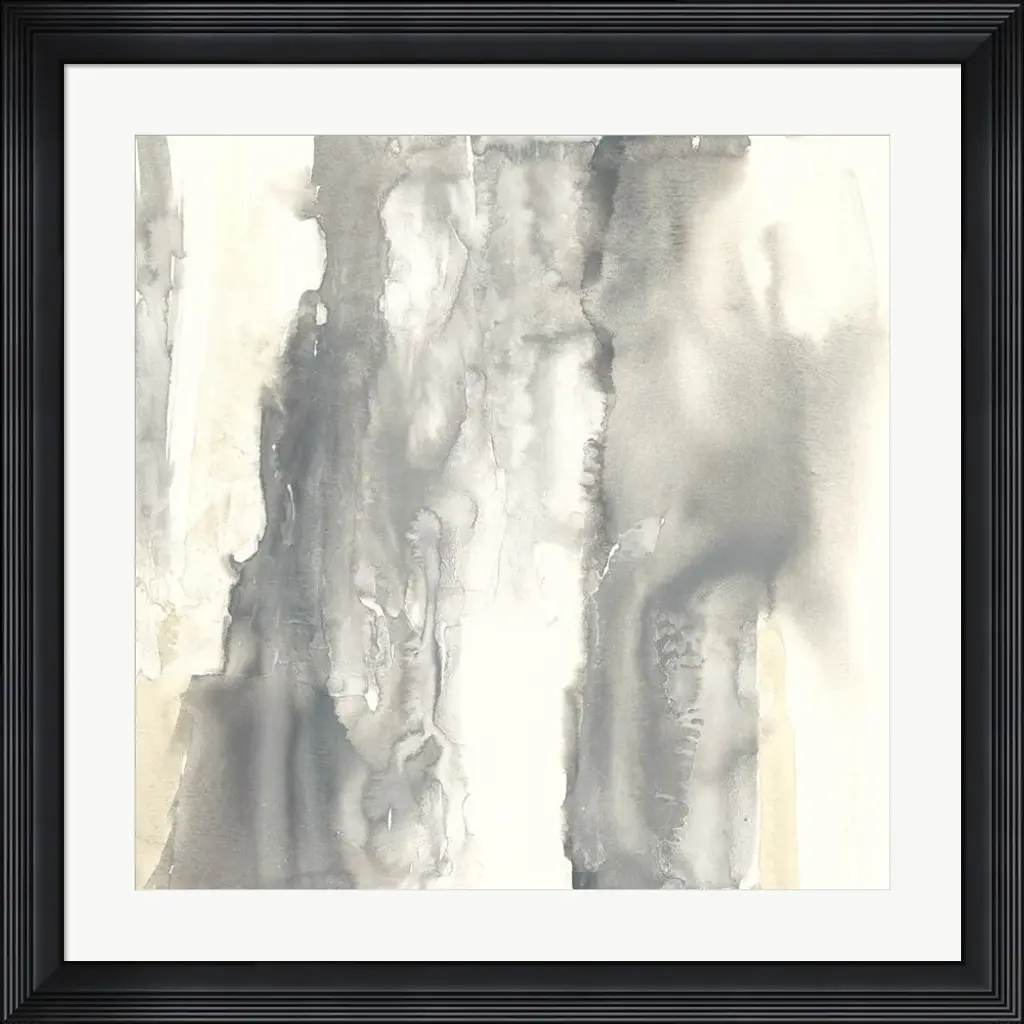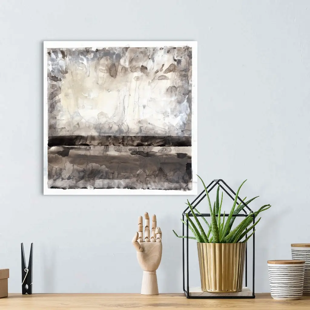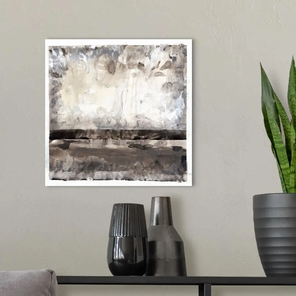 Smoky, neutral abstract painting with a white boarder and a thick black line moving horizontally through the center.