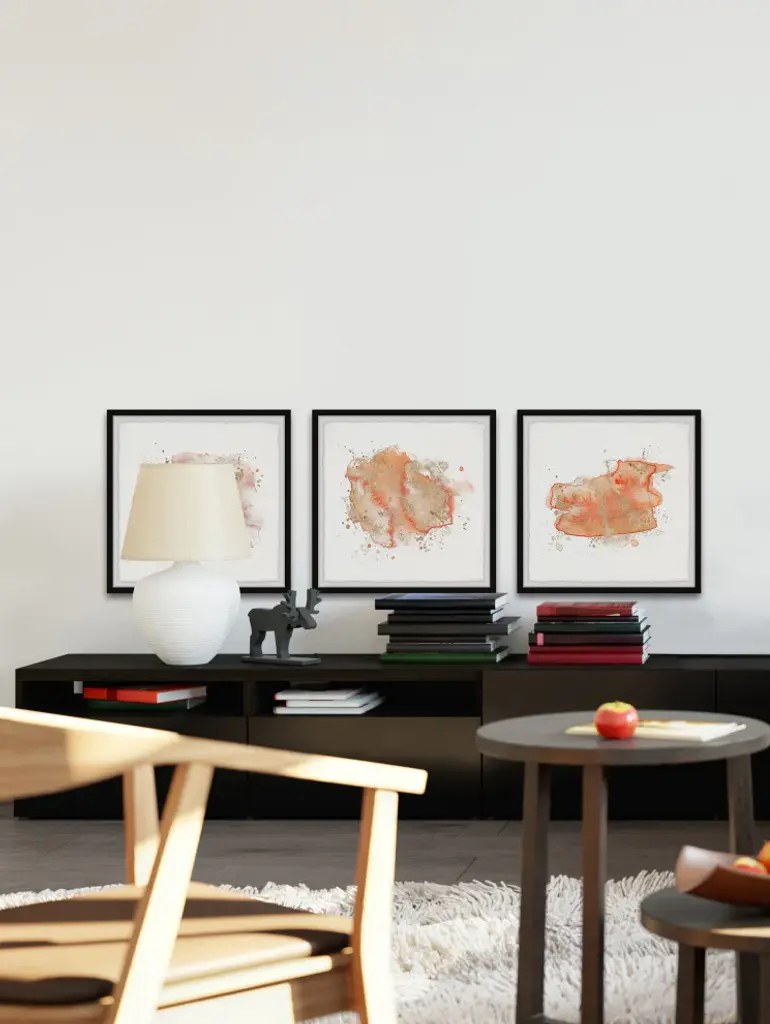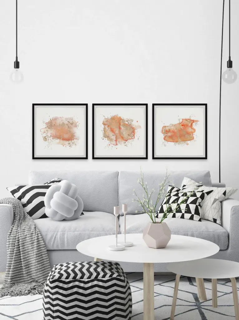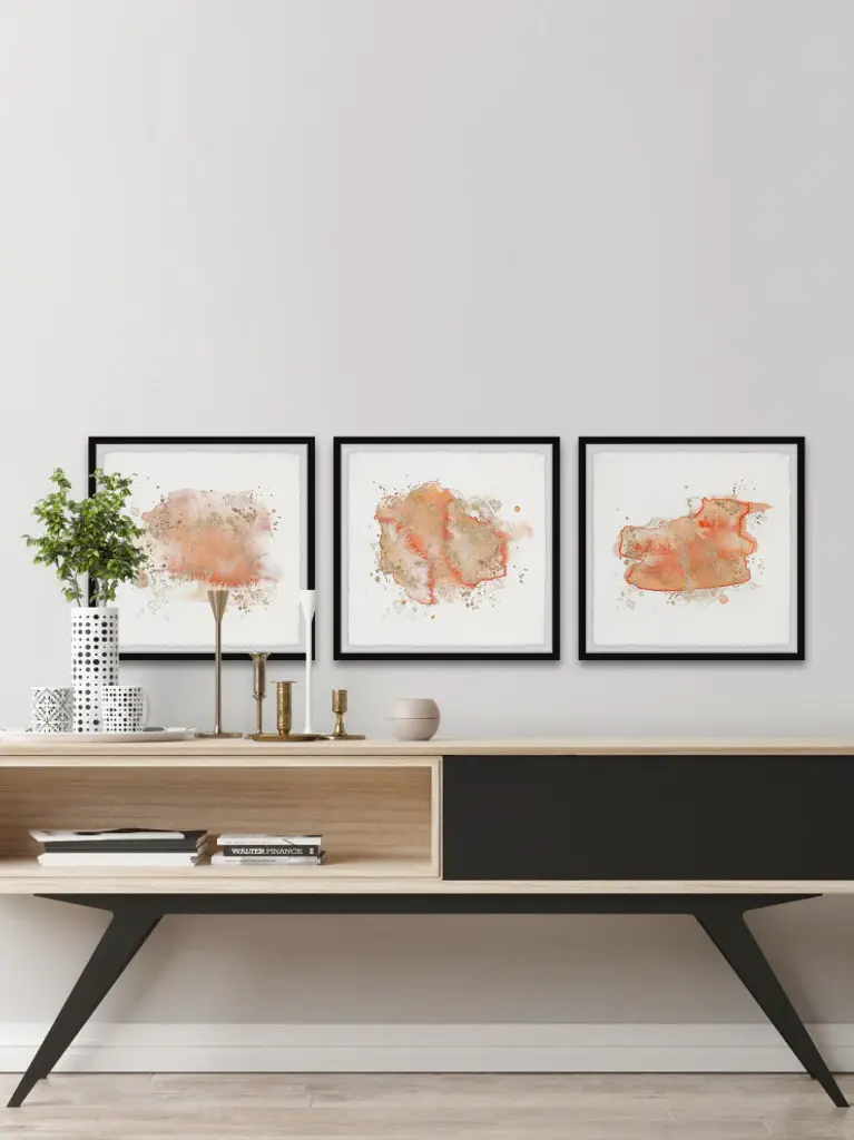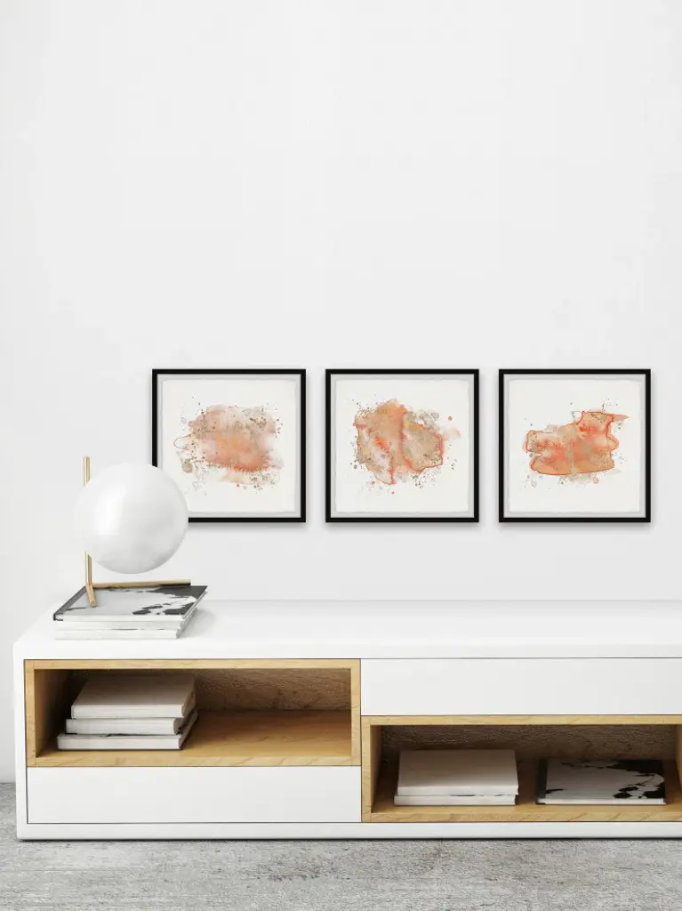 This trio of watercolor painting prints features an orange and gold abstract design that will lend a more modern feel to any spot in your home! Proudly printed in the USA, this piece is printed on high quality archive paper and professionally hand-framed. With wall-mounting hooks included, this artful accent is ready to hang up as soon as it reaches your front door.- (3) panels of 12x12- Top quality Giclee print on high resolution Archive Paper- Hand cut deckled edges- High quality durable non-warping frame- Finished under shatter resistant plexiglass- Arrives ready to hang- Includes a certificate of authenticity- Printed in the USA