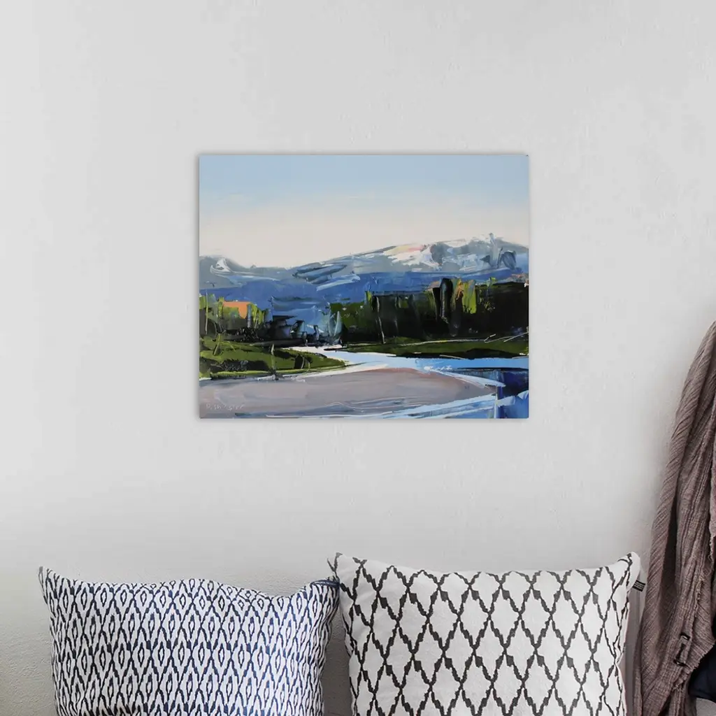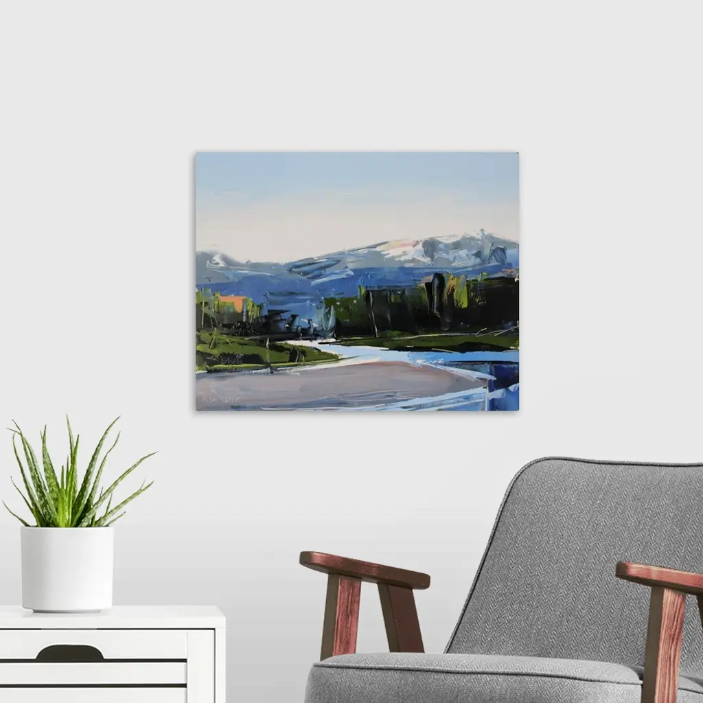 Contemporary palette knife painting of a green valley with a river running through it and mountains in the background.