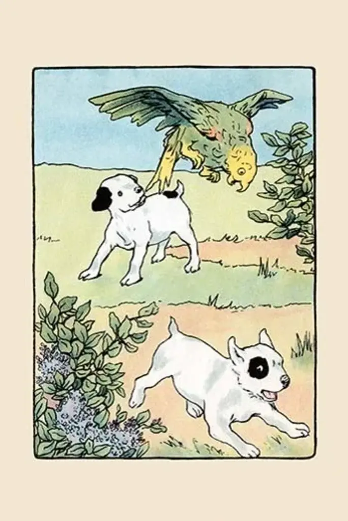 Two dogs, Snip and Snap and Polly Parrot play. An illustration from a series of children's books which came free with the Public Ledger newspaper.