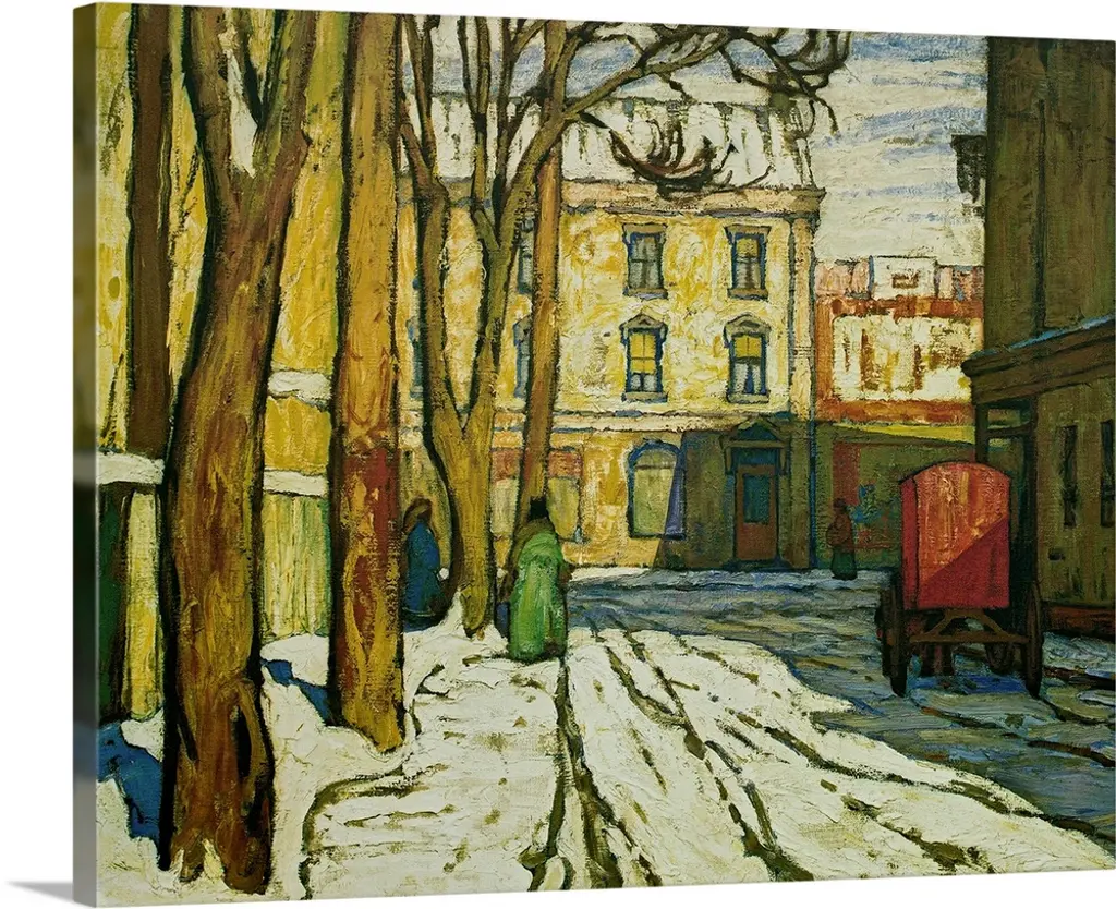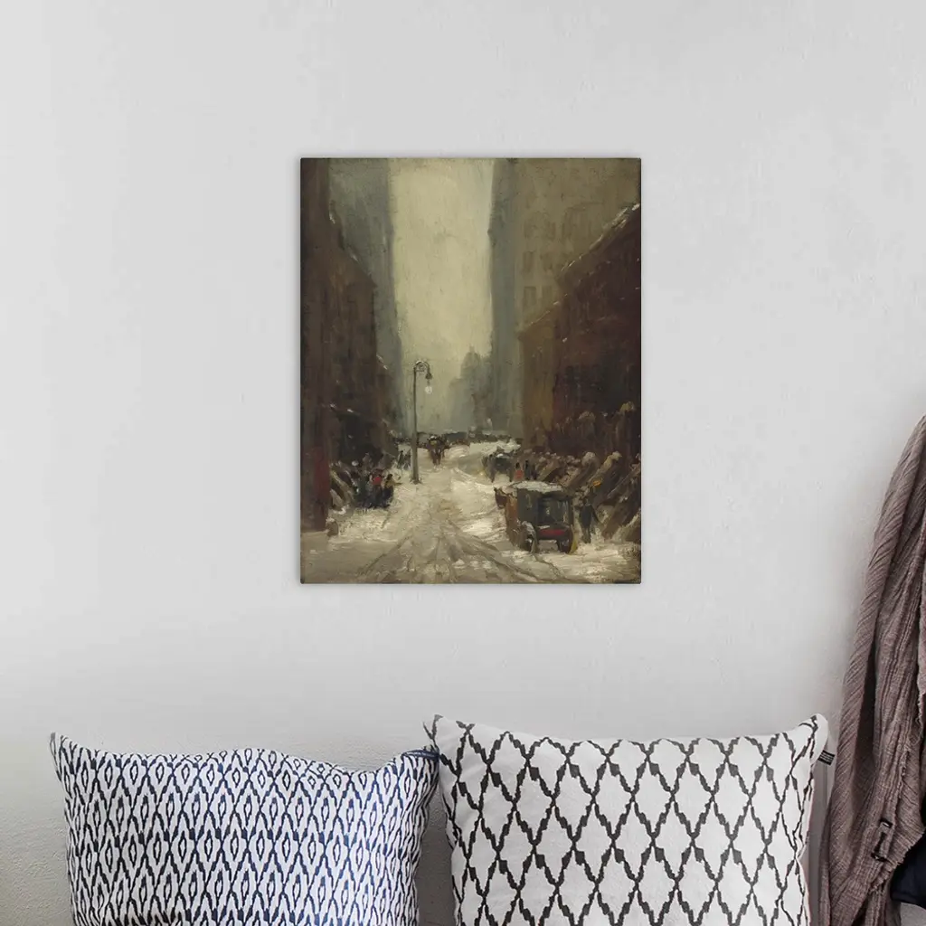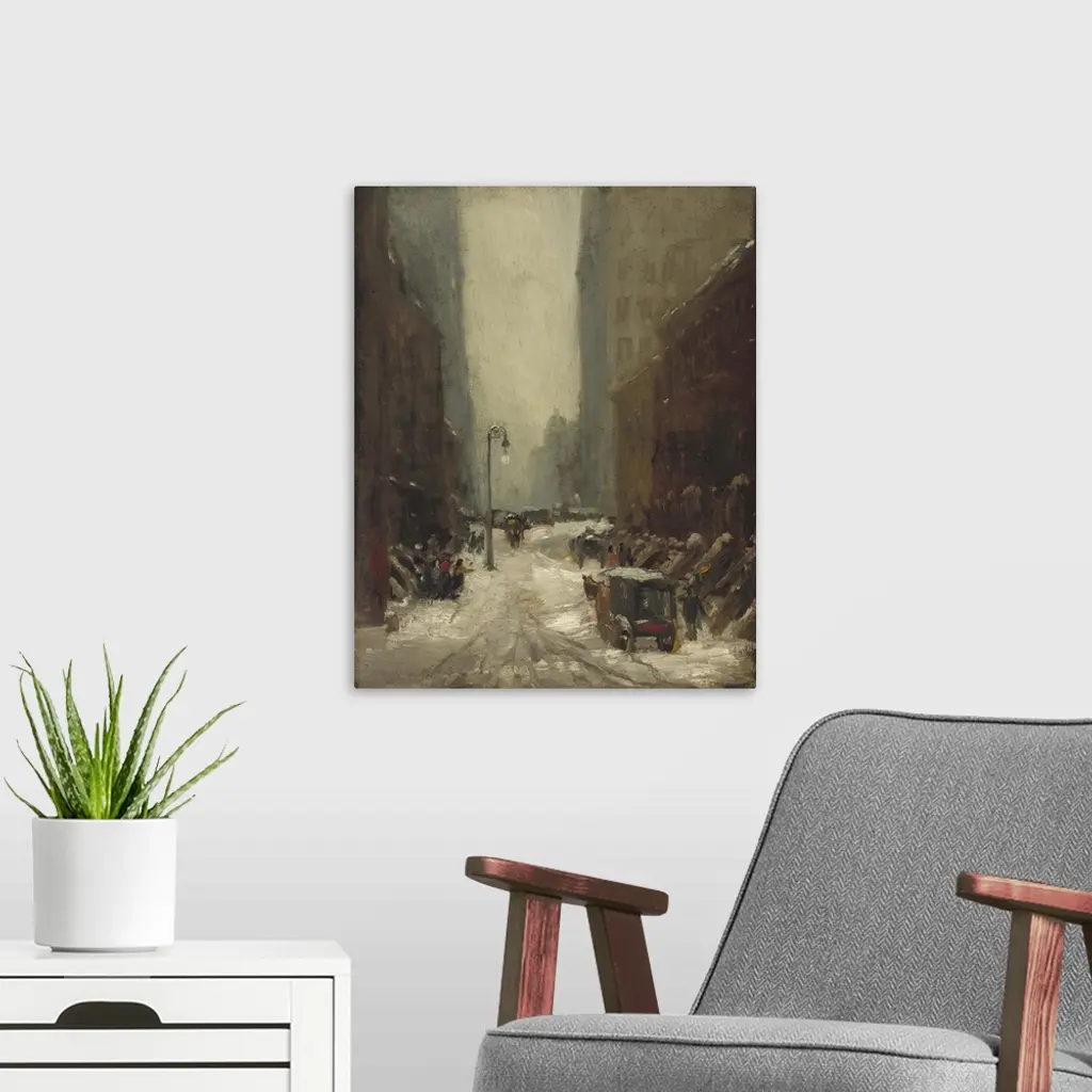 Snow in New York, by Robert Henri, 1902, American painting, oil on canvas. Brownstone apartments and office buildings during a snow storm on March 5, 1902. Already the snow in the street is becoming gray slush under horse cart wheels (BSLOC_2016_6_75)