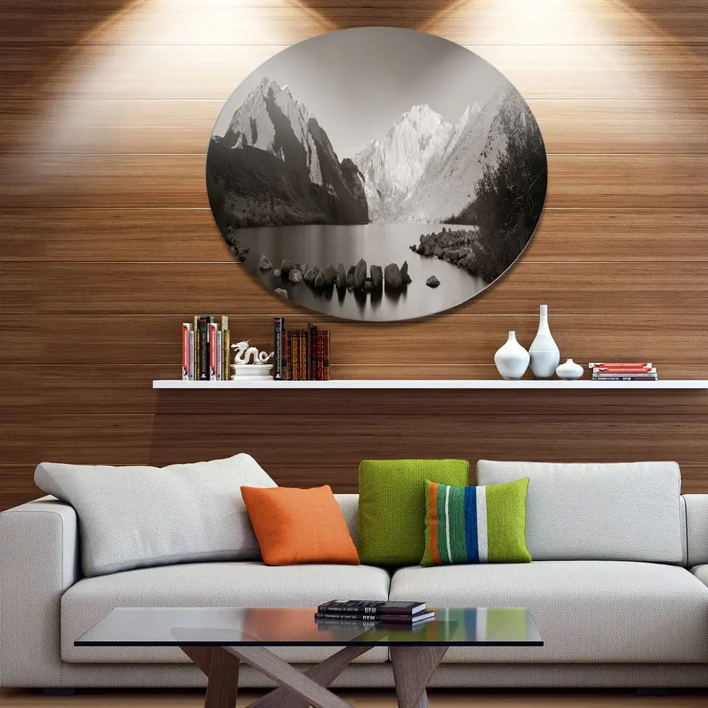 Bring Contemporary Abstraction to your home with this large Circle Metal wall art. This Snow Mountain Lake Panorama Metal Artwork makes it the focal point of any room or office. - White Gloss Coating ensures colors are extra vibrant with light reflection.- Aluminum grade Sheet Metal with 1 inch mounting frame on the back giving the illusion that the artwork is floating on the wall..- Mounting Brackets are included along with instructions.- High Quality Digital images are created directly into a glossy aluminum panel producing a stunning and captivating print into the glossy finish of the metal.- Water, Fire and Scratch resistant HD Aluminum panels.- Looks better than any photo paper and guaranteed to last at least 20 years- Easy to clean with a microfiber cloth. Colors are far superior to regular Canvas Art. - Easy to Hang