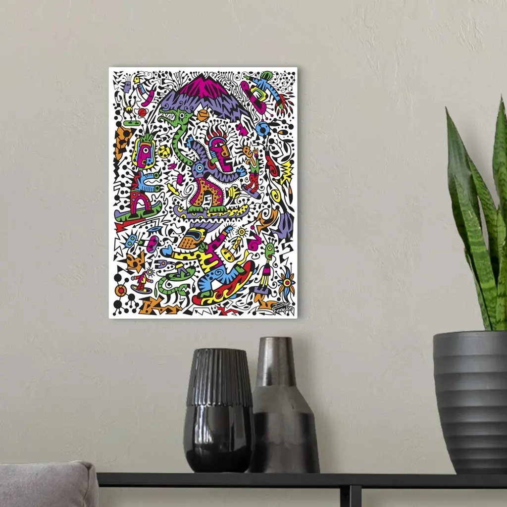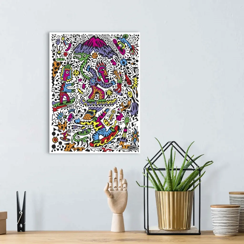 Contemporary mural artwork of snowboarders and other abstract figures in a confusion of colors and patterns.