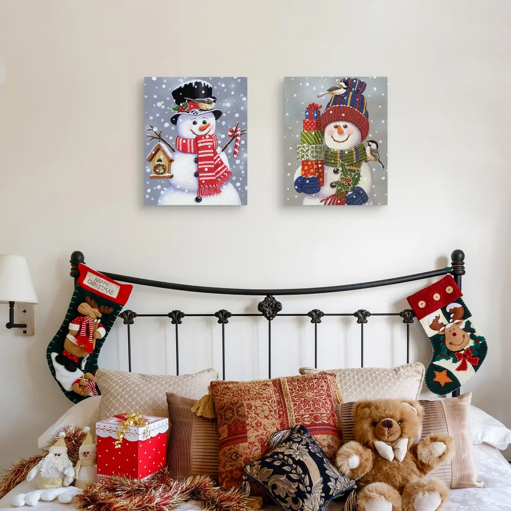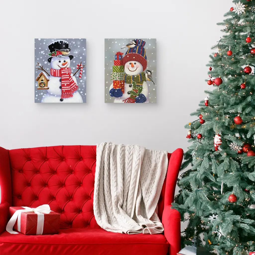 It seems even the snowmen are feeling the Christmas spirit! This duo of canvases are decked out in their finest knits, toting presents, holly, candy canes, and birdhouses. Let their adorable smiling faces grace your walls this season and enjoy a little holiday cheer.