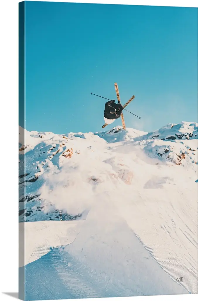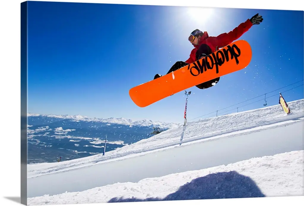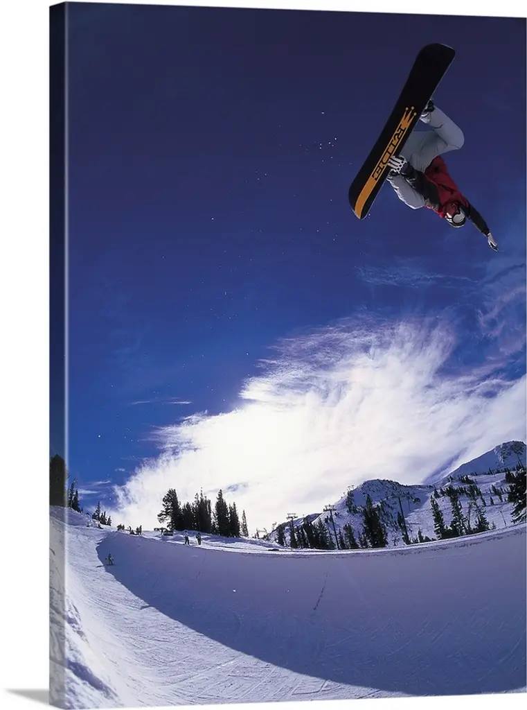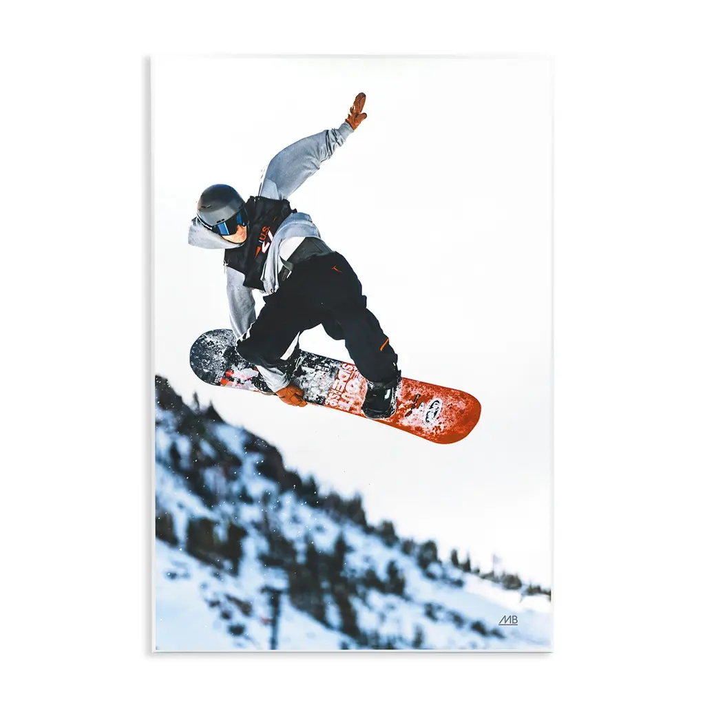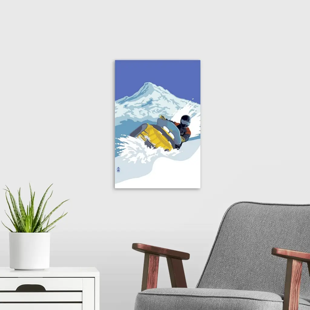 Retro stylized art poster of a person on a snowmobile, kicking up fresh snow.