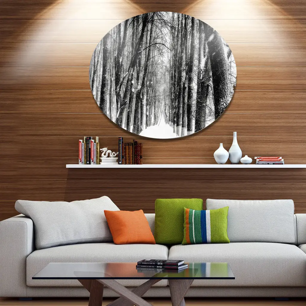 Bring Contemporary Abstraction to your home with this large Circle Metal wall art. This Snowy Forest Black and White Metal Artwork makes it the focal point of any room or office. - White Gloss Coating ensures colors are extra vibrant with light reflection.- Aluminum grade Sheet Metal with 1 inch mounting frame on the back giving the illusion that the artwork is floating on the wall..- Mounting Brackets are included along with instructions.- High Quality Digital images are created directly into a glossy aluminum panel producing a stunning and captivating print into the glossy finish of the metal.- Water, Fire and Scratch resistant HD Aluminum panels.- Looks better than any photo paper and guaranteed to last at least 20 years- Easy to clean with a microfiber cloth. Colors are far superior to regular Canvas Art. - Easy to Hang
