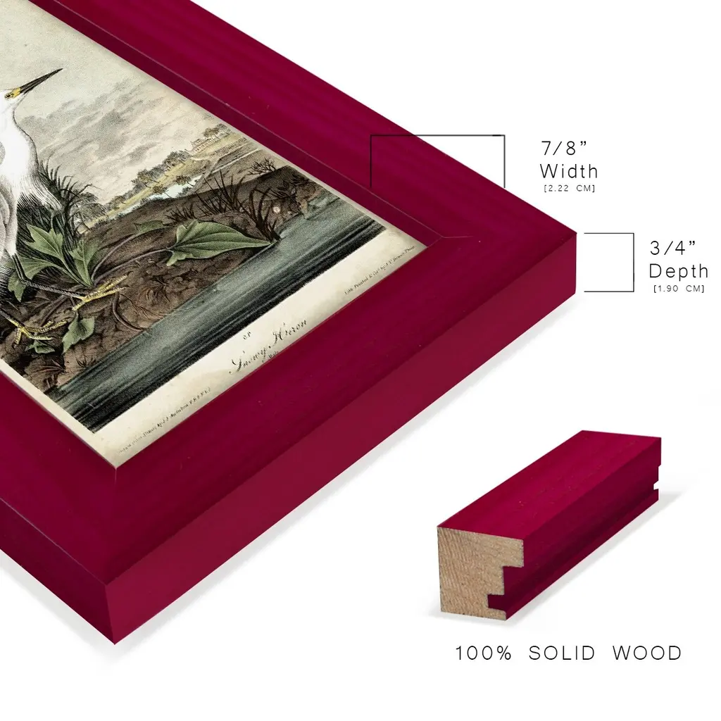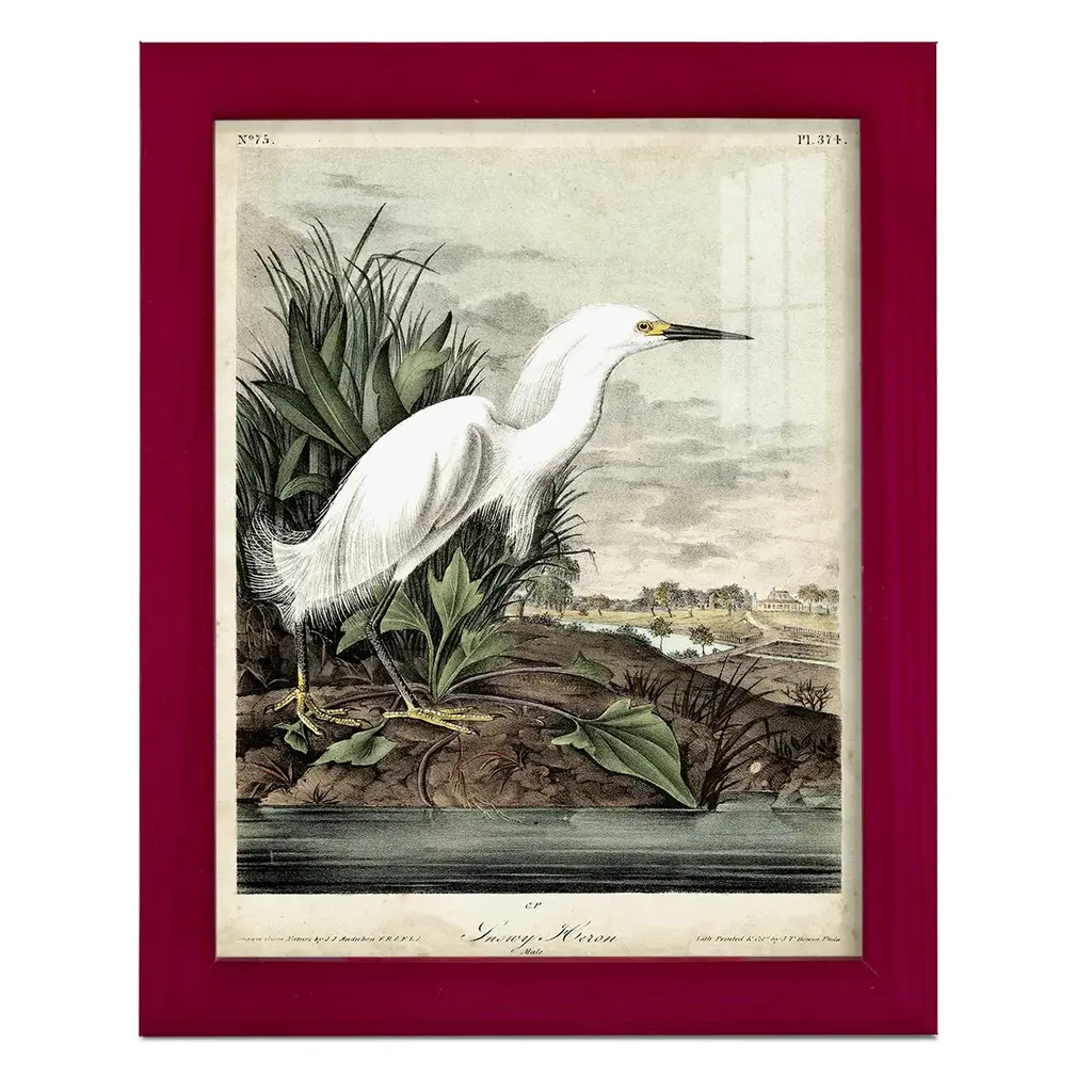 Snowy Heron -EZ SWITCH Framed Print w/glass-Cherry Red A delightful, framed print. Featuring a solid wood frame with real wood glass. This premium print is giclee quality. In addition, every frame features a removable back and table top stand. This allows you to change your art in the future or to just stand the art on a table for a new look. We are sure you'll enjoy our new series of EZ SWITCH Framed Art. Solid Wood Frame Real Glass Removable / Replaceable Art Built in Tabletop Stand Sizes range from 4x6 up to 12x15 - buy just one or pair them up as sets as you see fit.