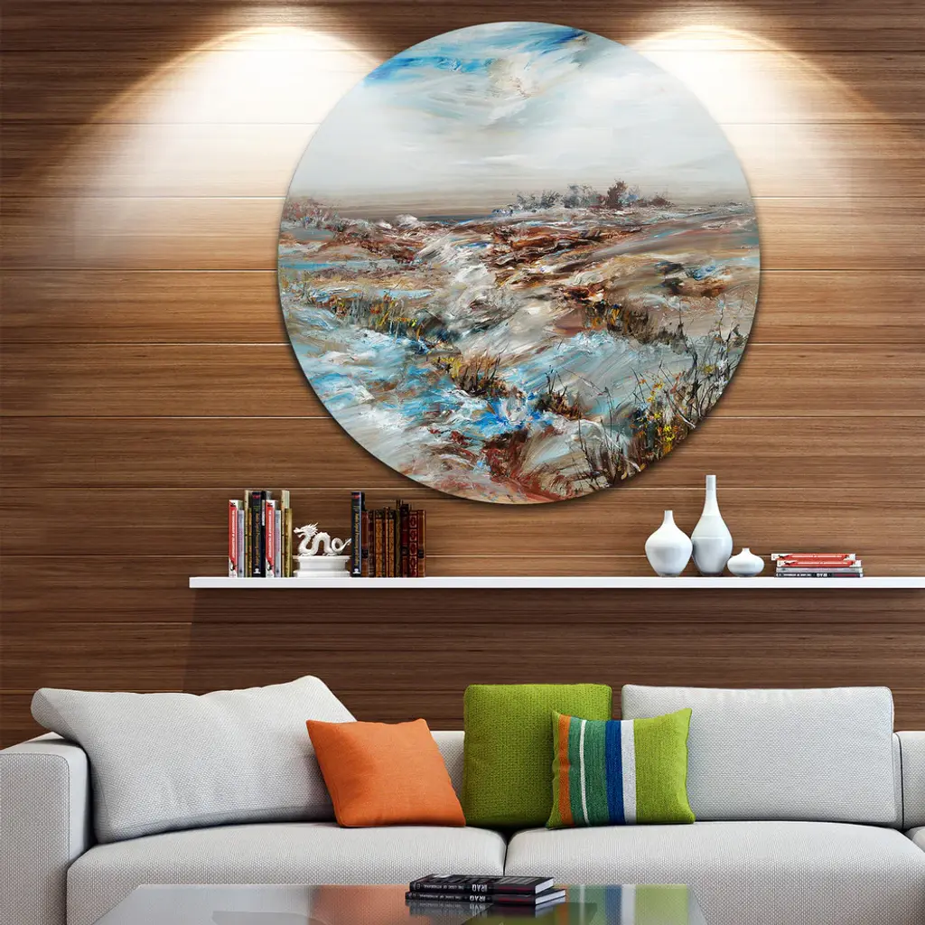 Bring Contemporary Abstraction to your home with this large Circle Metal wall art. This Snowy Landscape Metal Artwork makes it the focal point of any room or office. - White Gloss Coating ensures colors are extra vibrant with light reflection.- Aluminum grade Sheet Metal with 1 inch mounting frame on the back giving the illusion that the artwork is floating on the wall..- Mounting Brackets are included along with instructions.- High Quality Digital images are created directly into a glossy aluminum panel producing a stunning and captivating print into the glossy finish of the metal.- Water, Fire and Scratch resistant HD Aluminum panels.- Looks better than any photo paper and guaranteed to last at least 20 years- Easy to clean with a microfiber cloth. Colors are far superior to regular Canvas Art. - Easy to Hang