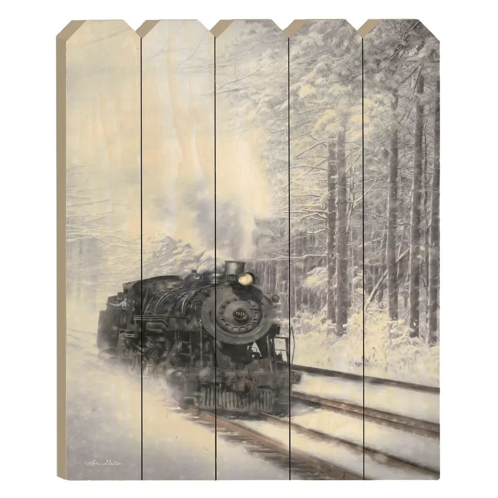 Snowy Locomotive Unframed Picket Fence Wall Art - White