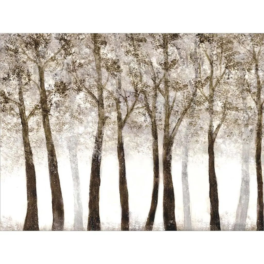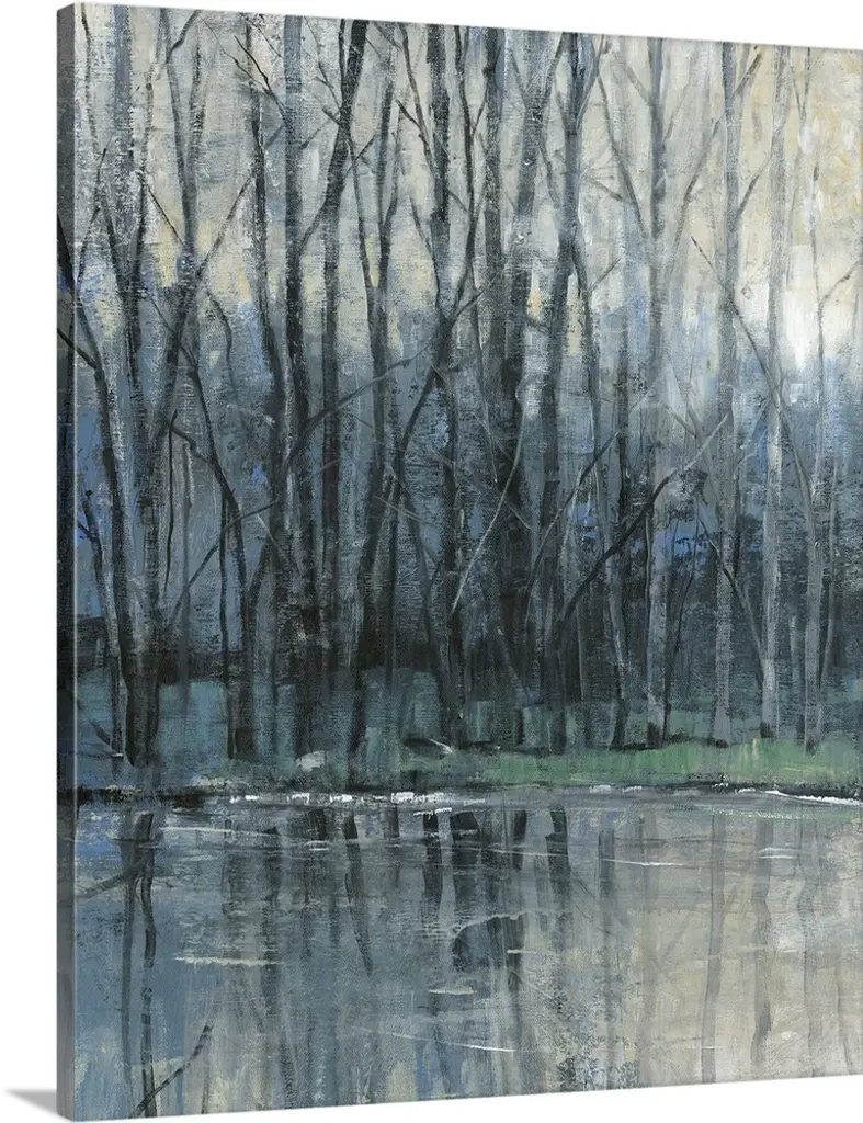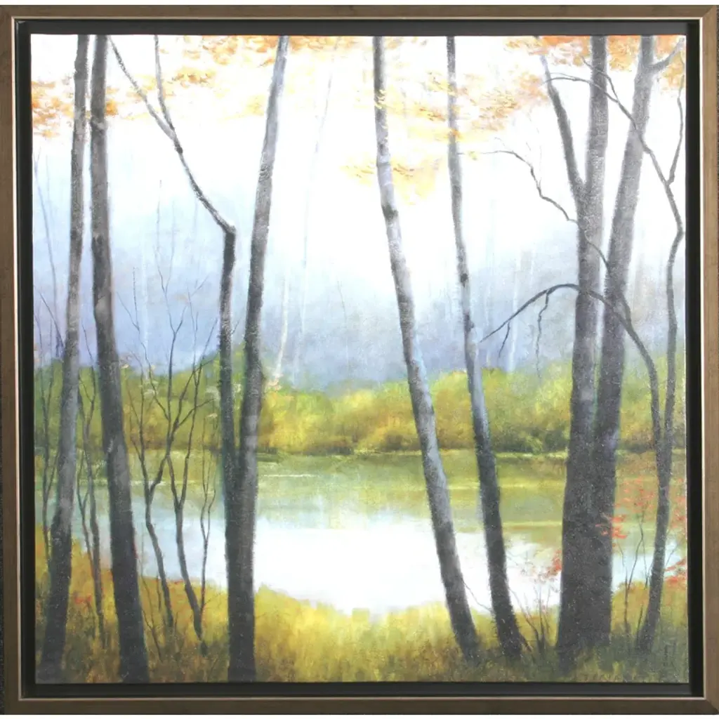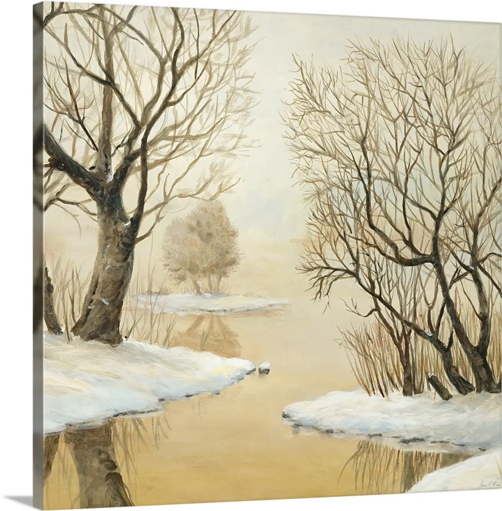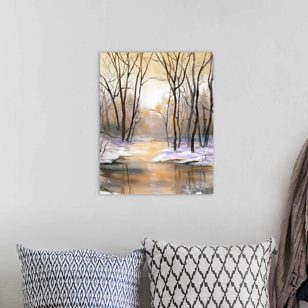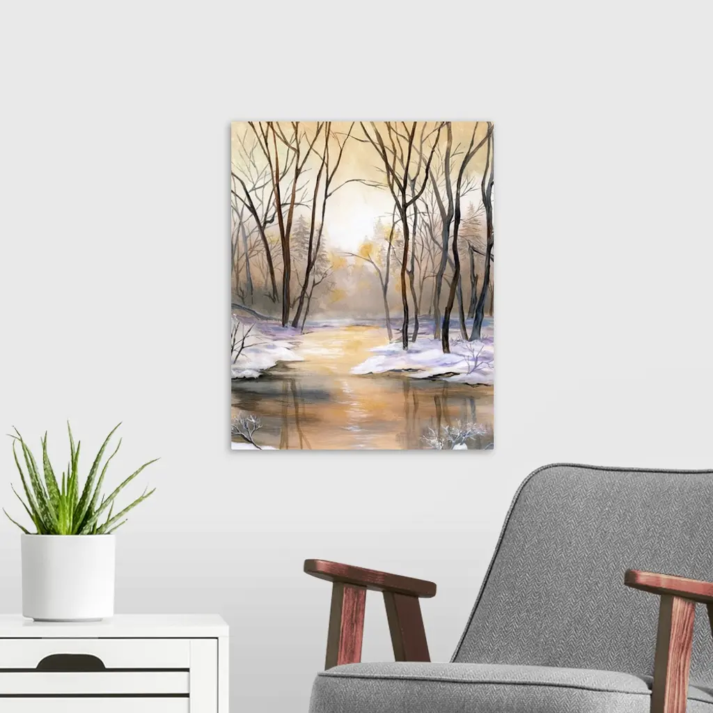 Landscape painting of a river lined with snow and tall bare Winter trees during a golden sunset.