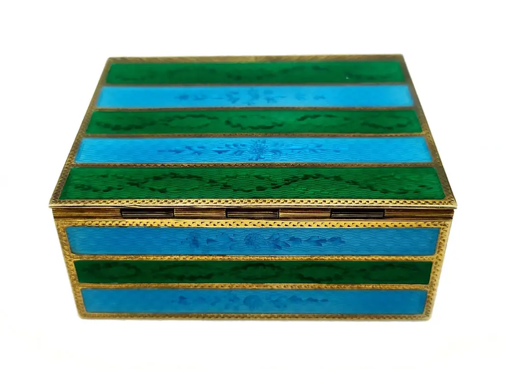 Rectangular snuffbox in 925/1000 sterling silver gold plated with two-tone translucent stripes fired enamelled on guillochè and fine hand-engraved on all sides, French Empire Napoleon III style. Dimensions cm. 6 x 7.2 x 3. Designed by Franco Salimbeni in 1983 and produced in the Salimbeni company headquarters with manual processing by skilled artisan artists with a thick plate suitable for withstanding numerous enamelled firings at high heat at around 800° C. About enamelingThere are about 700 different colors of enamel, but in practical use today is limited to about two hundred. However, the layering of different colors allows an almost infinite range of combinations and nuances that can degrade, even on the same object, the darker shades to lighter ones, and vice versa.The object that you want to realize that may then be covered with enamel, must be built not just taking care of details in relation to the subsequent application of powdered glass. Assuming the case that it should be silver, care should be taken that the sheets have a thickness such as to withstand the high temperature “cooking” of the enamel which is not too far from the melting point of silver.Even the title of the metal must be chosen depending on the type of enamel to be applied, because some colors have made different color depending on the greater or lesser quantity of the alloy contained in the metal. The welds must also be such as to prevent deformation of the object exposed to the temperature of repeated firings for the liquefaction of the different colors of the enamel.The larger, finally, is the object and the surface to be coated, the greater effort and attention will be needed to ensure that no record distortions and depressions of the sheets treated. The surfaces to be coated must be surrounded by a step at a slight angle, which can contain the liquid glaze. Typically you use to dig the plate to create usable space, while other times you fillet weld around the plate to be enamelled. Very nice especially the hand-engraved reproducing landscapes, architecture, paintings from the Renaissance period. Finally, before moving on to the stage of enamel, each object must be cleaned with brushes and pickling acids with special care because, especially working the silver, not all the metal oxide glazes turn out to be compatible with the oxide of silver, for which it is necessary to eliminate it completely or at least with extreme care to avoid direct contact with the metal of certain colors, interposing a layer of transparent enamel.Another very effective technique is called enamel “en ronde bosse”, suitable to be applied to the enamel surfaces in the round, such as figurines, eggs etc.. This technique is particularly difficult and delicate because the glass part is still fluid, at high temperature, must be made to adhere to non-planar surfaces, and it takes great skill and attention to ensure that it does not coli downwards, or solidify second different thicknesses, resulting in shades unwanted color.