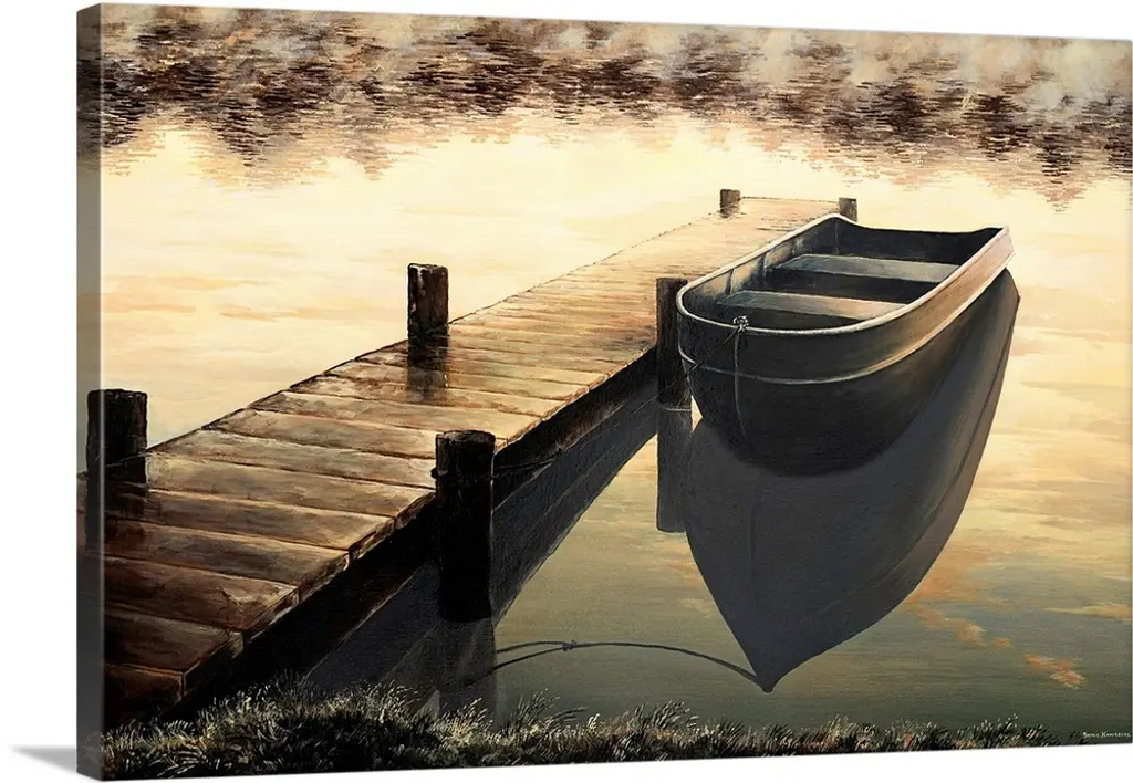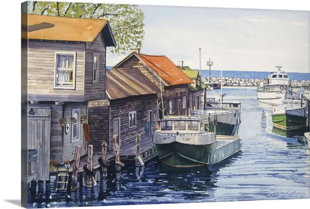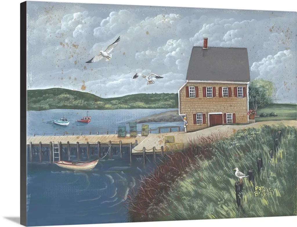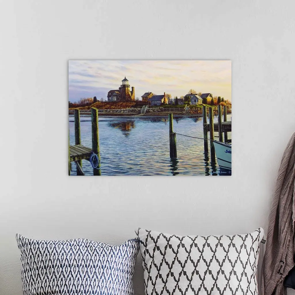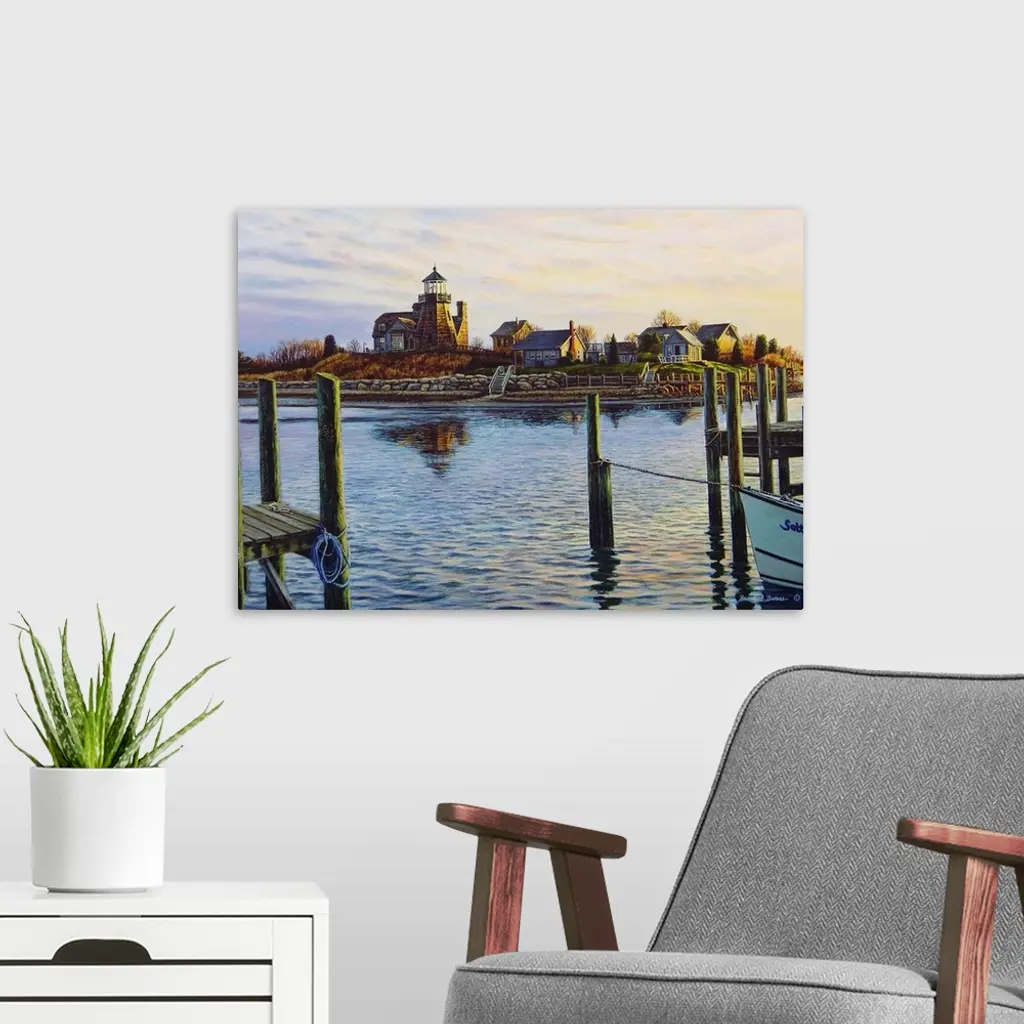 Contemporary artwork of a water scene overlooking harbor with a lighthouse.