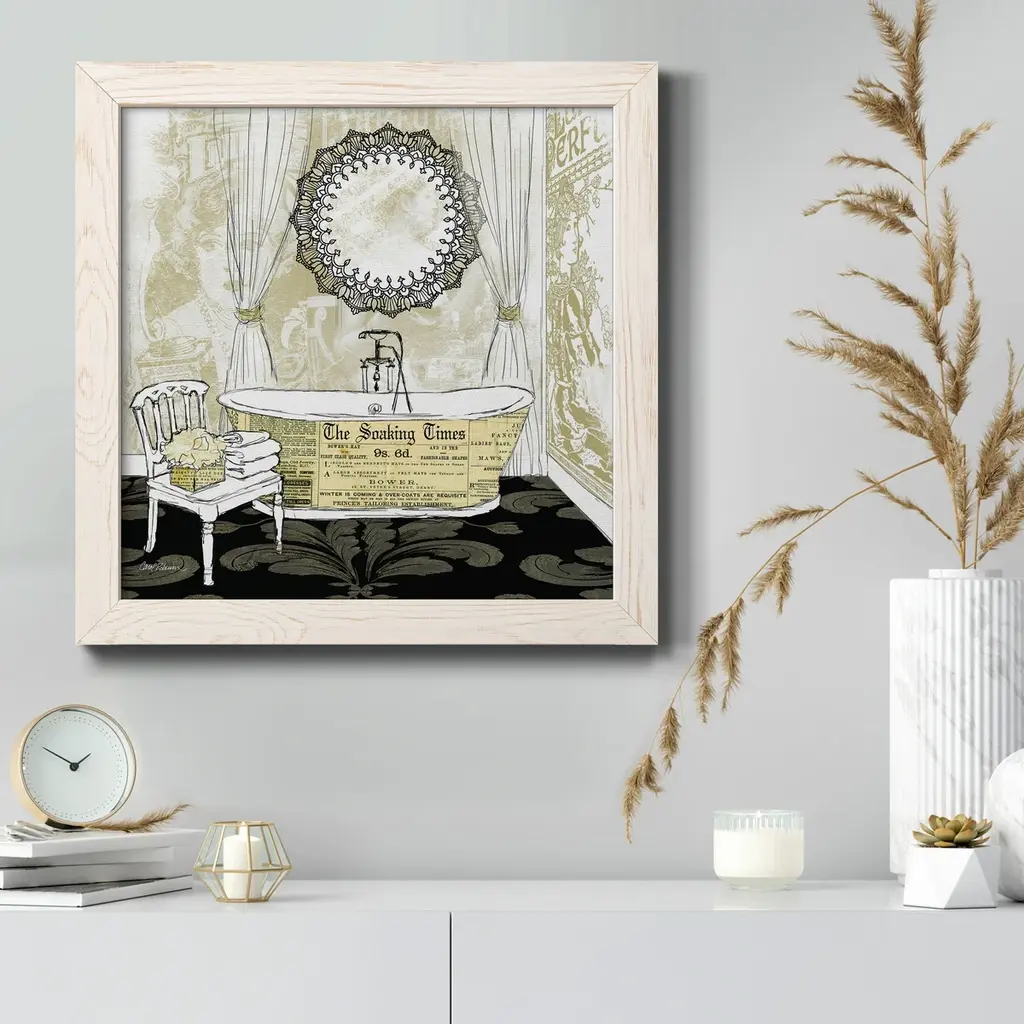 Soaking Times-Premium Framed Canvas - Ready to Hang Framed in distressed wood and available in an array of sizes and colors Each piece is joined and assembled by hand and comes ready to hang 2 INCH BEVELED MATTE BOARD PLEXIGLASS COVERING READY TO HANG MADE IN THE USA SOLID WOOD FRAME MADE IN USA FADE RESISTANT GICLEE PRINTING on Canvas or Paper