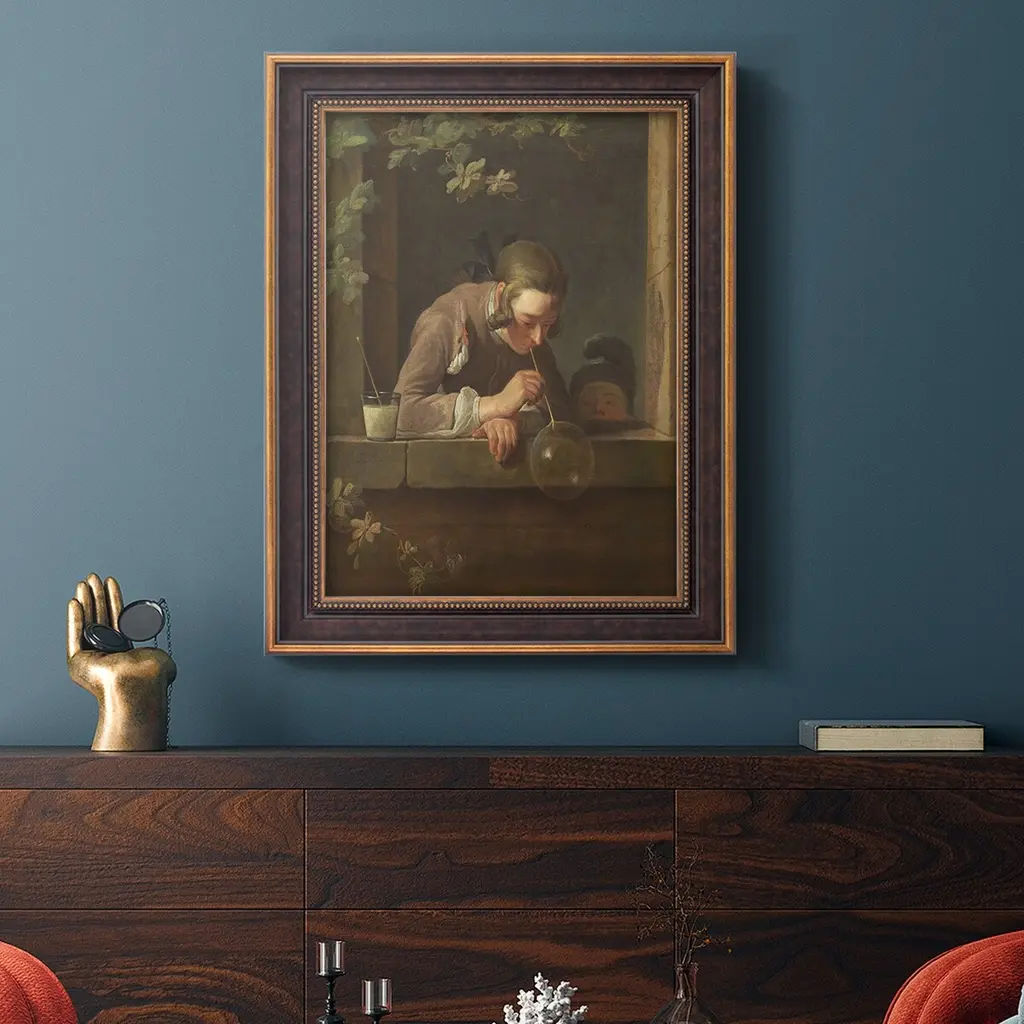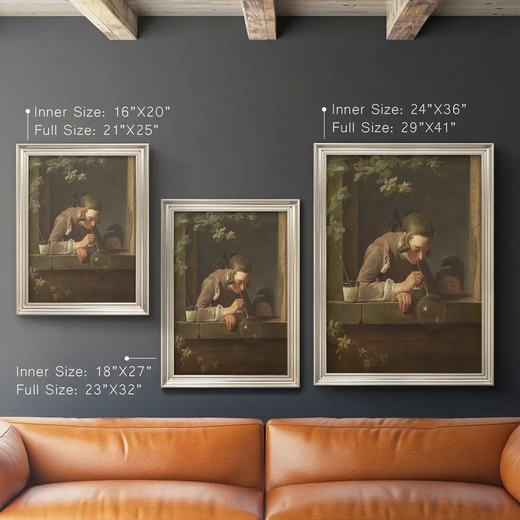Soap Bubbles Premium Framed Canvas- Ready to Hang A Premium Framed Canvas created to last. Framed in distressed wood and available in an array of sizes and colors Featuring a beveled a solid wood stretcher bar, each piece comes ready to hand 3 SIZES AVAILABLE 16''X20'' - Overall Size 18'X27'' - Overall Size 24''x36'' - Overall Size Each piece is made to order. Each piece comes with hanging hardware. Made in the USA Ready to Hang Giclee Paper Print Acrylic Glass Beveled Matt Board