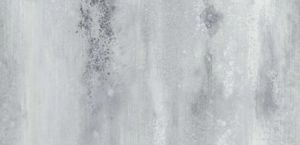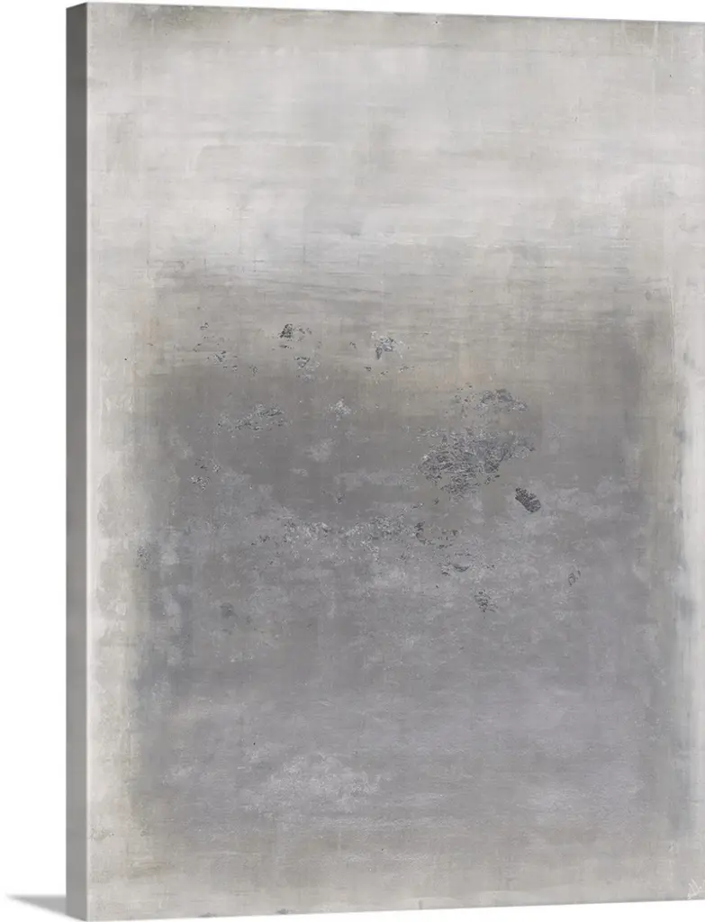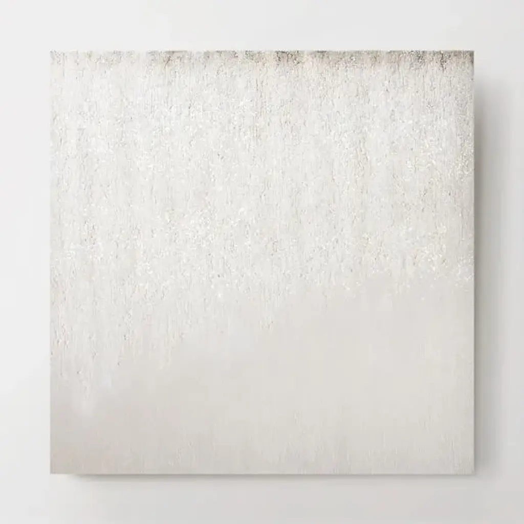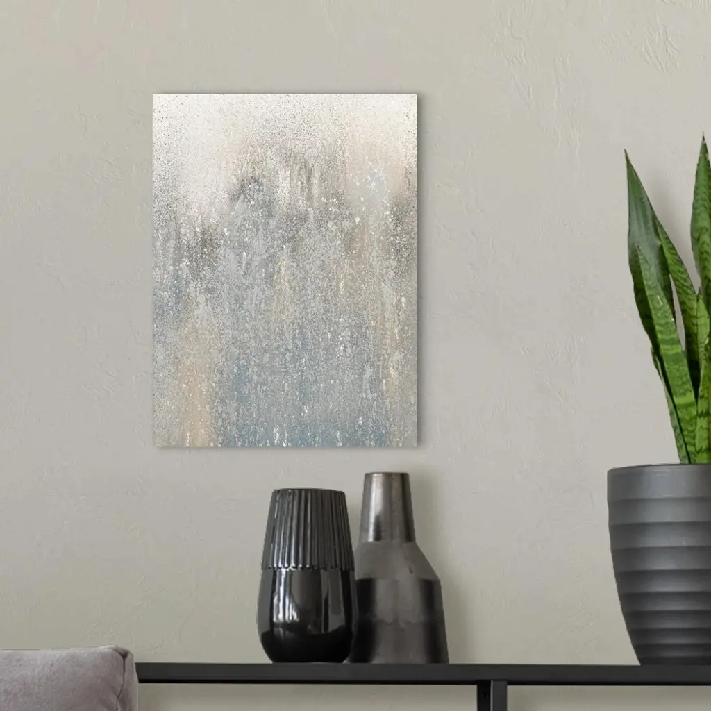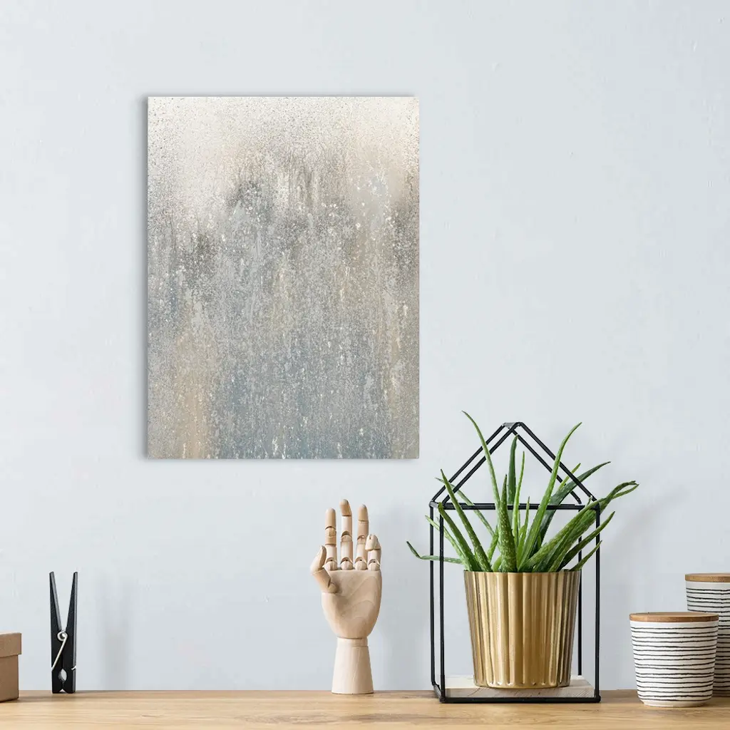 Contemporary abstract painting created with shades of tan and gray splattered all over the canvas with the splatter more dense in the middle and at the bottom.