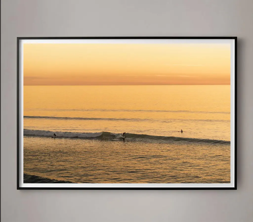 A trio of surfers gather along the Southern California coast as the sunrise casts it's golden hue. Unframed photograph printed on Archival 100% cotton (tree-free) Somerset Velvet Fine Art Paper which has a matte finish. Unframed prints ship in heavy duty mailing tubes.