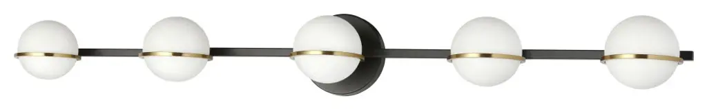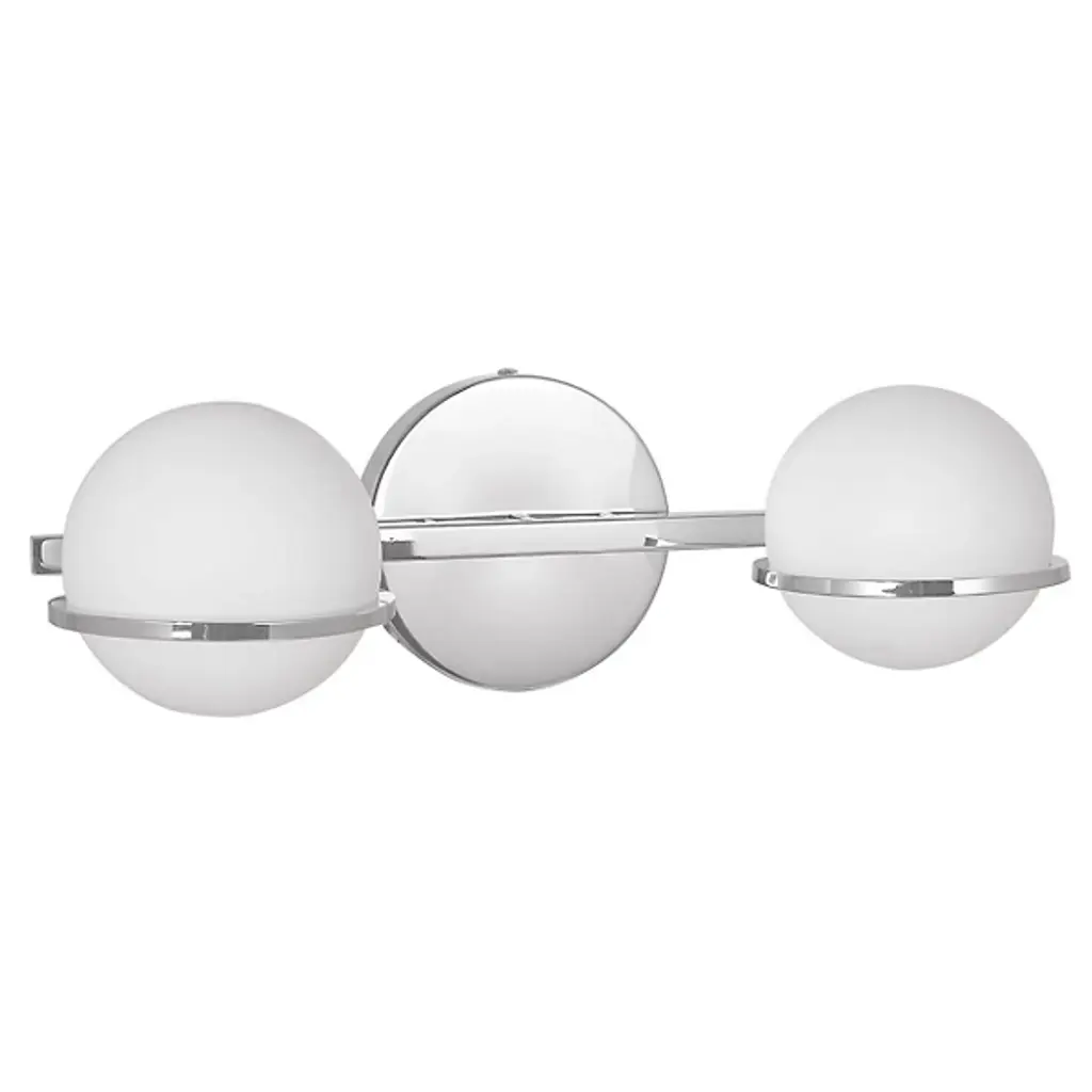Brilliant globes of sophistication. Crown your bathroom mirrors with the Sofia Vanity Light from Dainolite, a refined piece accentuating the enduring sphere motifs of mid-century modern design. The piece sets the stage for its globes with a mimicking circular metal backplate. Sharpened up in silhouette by a trim crossbar, crisp ring holders present the spheres with an accenting quality. Made in white glass, the rounded shades nestle inside the metal rings, creating an inviting opaque look even with the lights off. The piece lights up to produce 360-degree spreads of clean light through the geometrically perfect shades.