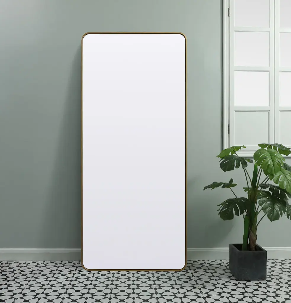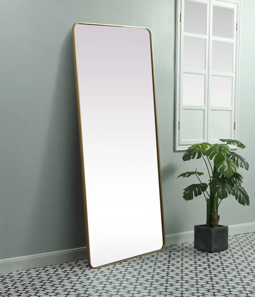 Add a soft-corner rectangular full length mirror to your home decor to elevate it to the next level. A full-length mirror is the perfect wall decor choice for any room or living space. This accessory is perfect for adoring full outfits in the full length of your body or providing a full view of yourself in any room, perfect for dressing areas and even bathrooms. Not only does this full-length iron frame large wall mirror provide practical uses, but it also acts as a beautiful addition to any home decor with its sleek, modern design. The mirror can be leaned to the wall, free-standing or can be installed vertically or horizontally. Available in three satin finishes: black, brass, and silver.Versatile soft corner full length mirror provides a full body view in two ways: leaned it against the wall or mount it on any secure wall to save space. (mounting hardware is not provided)the mirror comes with a solid MDF board backing and four welded keyhole hanger for easy installationMirror is recessed into the ultra-thin iron sturdy metal frameperfect accent mirror to add visual interest and depth to your bedroom, living room, bathroom, entry way or any room!can be mounted both in a vertical or horizontal orientationmirror arrives at your home in one piece with no installation requiredglass insert measures 31.21 inch wide X 0.16 inch deep X 71.21 inch high