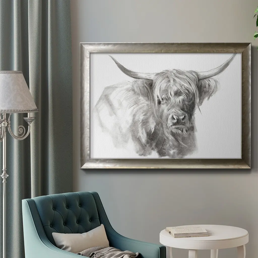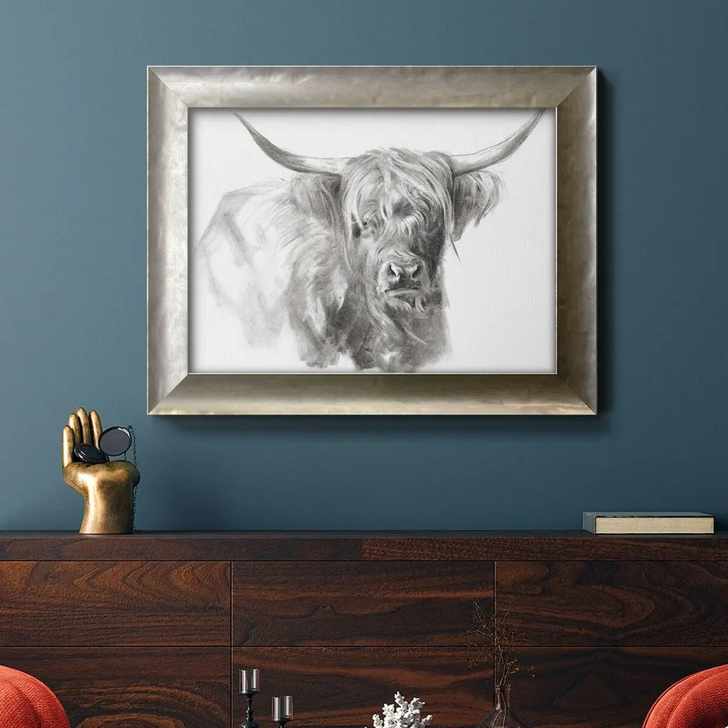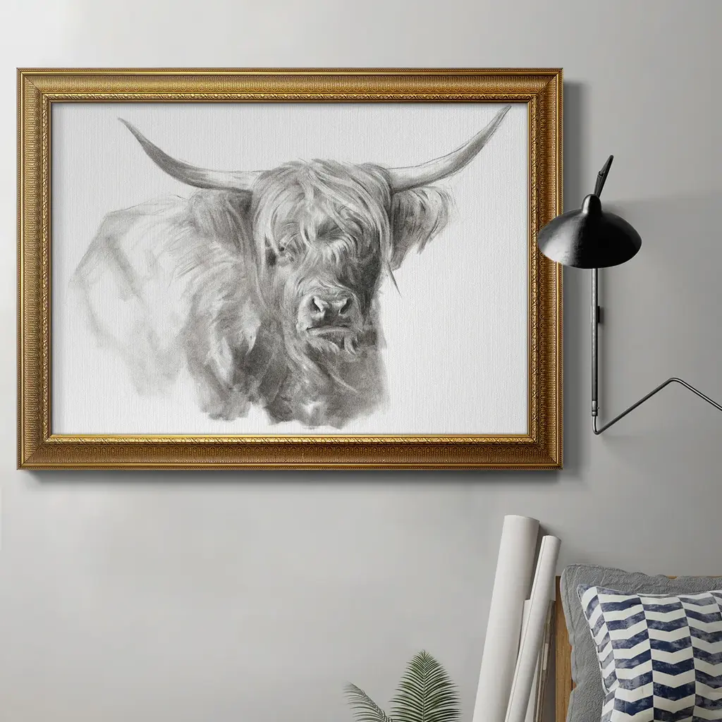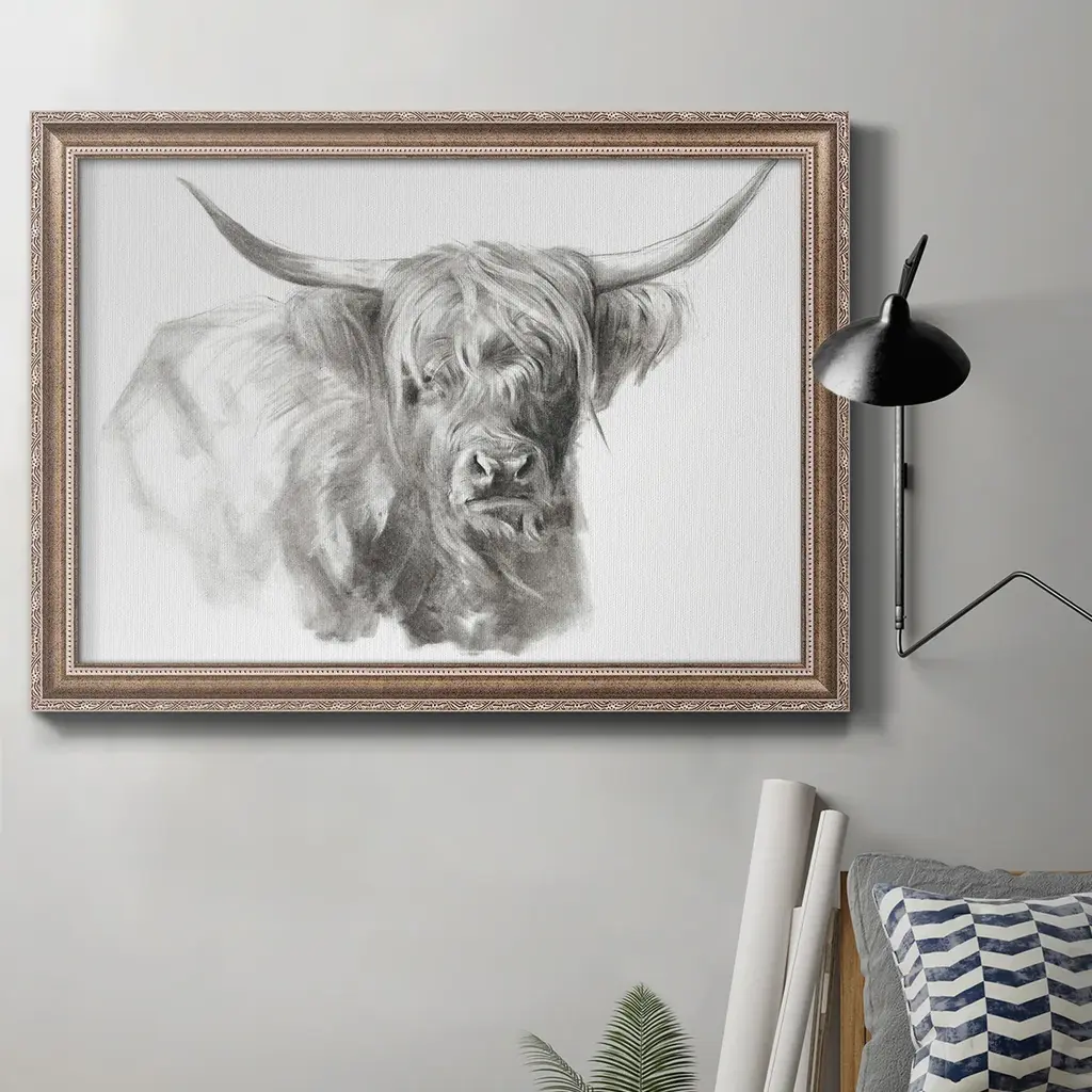 Soft Focus Highland Cattle I Premium Framed Canvas- Ready to Hang A Premium Framed Canvas created to last. Framed in distressed wood and available in an array of sizes and colors Featuring a beveled a solid wood stretcher bar, each piece comes ready to hand 3 SIZES AVAILABLE 16''X20'' - Overall Size 18'X27'' - Overall Size 24''x36'' - Overall Size Each piece is made to order. Each piece comes with hanging hardware. Made in the USA Ready to Hang Giclee Paper Print Acrylic Glass Beveled Matt Board