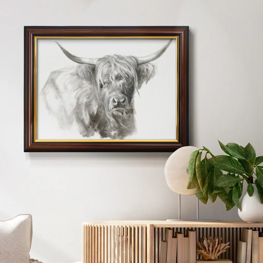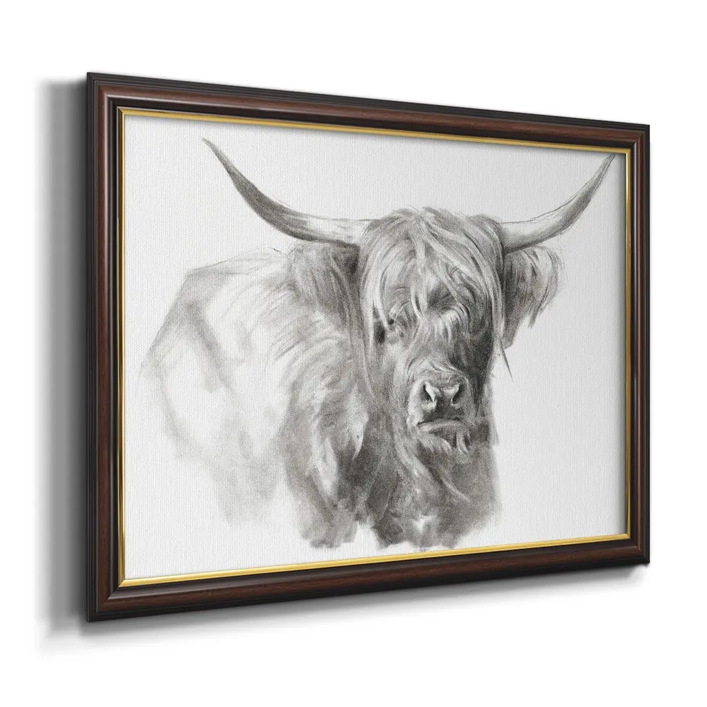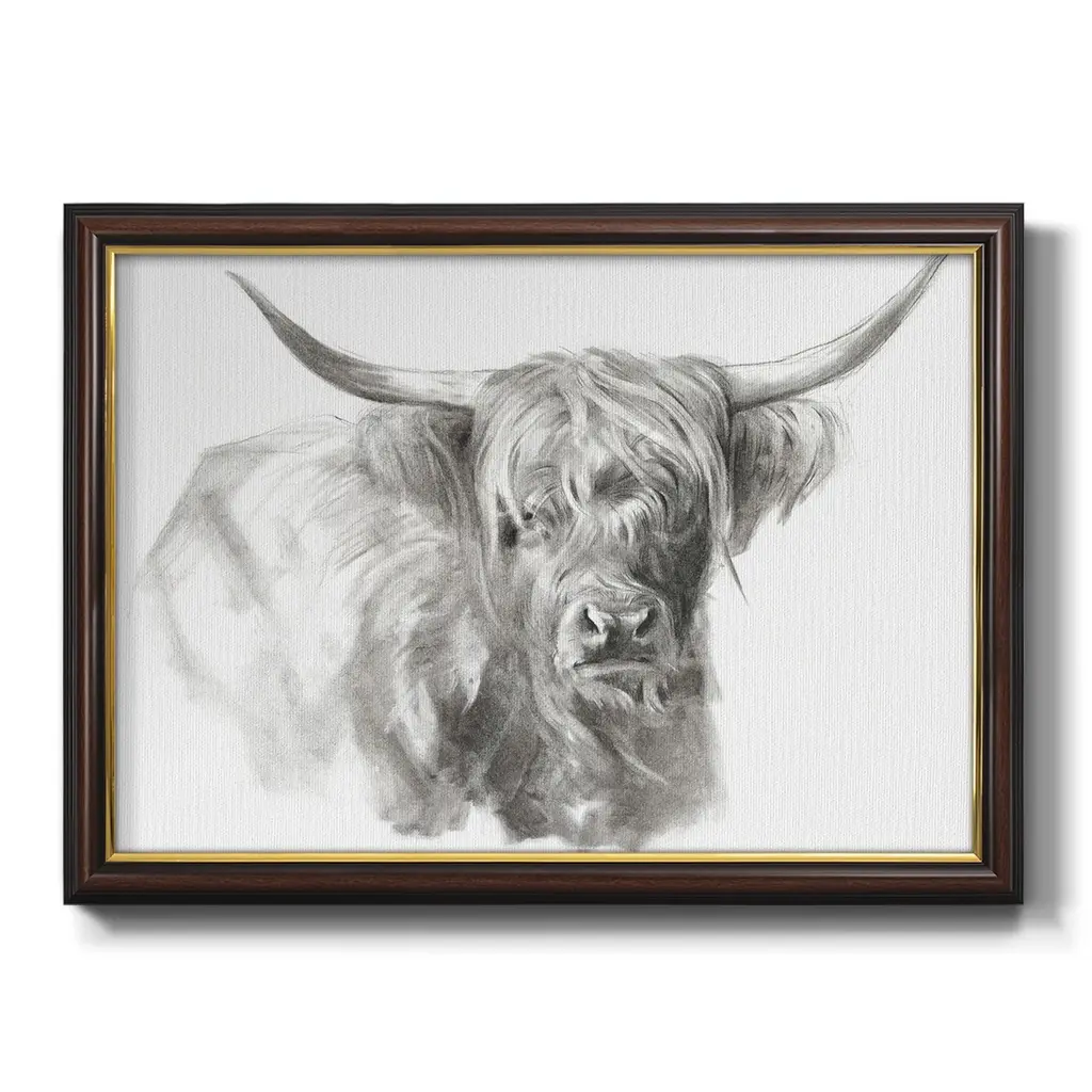 Soft Focus Highland Cattle I Premium Framed Canvas- Ready to Hang A Premium Framed Canvas created to last. Framed in distressed wood and available in an array of sizes and colors Featuring a beveled a solid wood stretcher bar, each piece comes ready to hand 3 SIZES AVAILABLE 16''X20'' - Overall Size 18'X27'' - Overall Size 24''x36'' - Overall Size Each piece is made to order. Each piece comes with hanging hardware. Made in the USA Ready to Hang Giclee Paper Print Acrylic Glass Beveled Matt Board