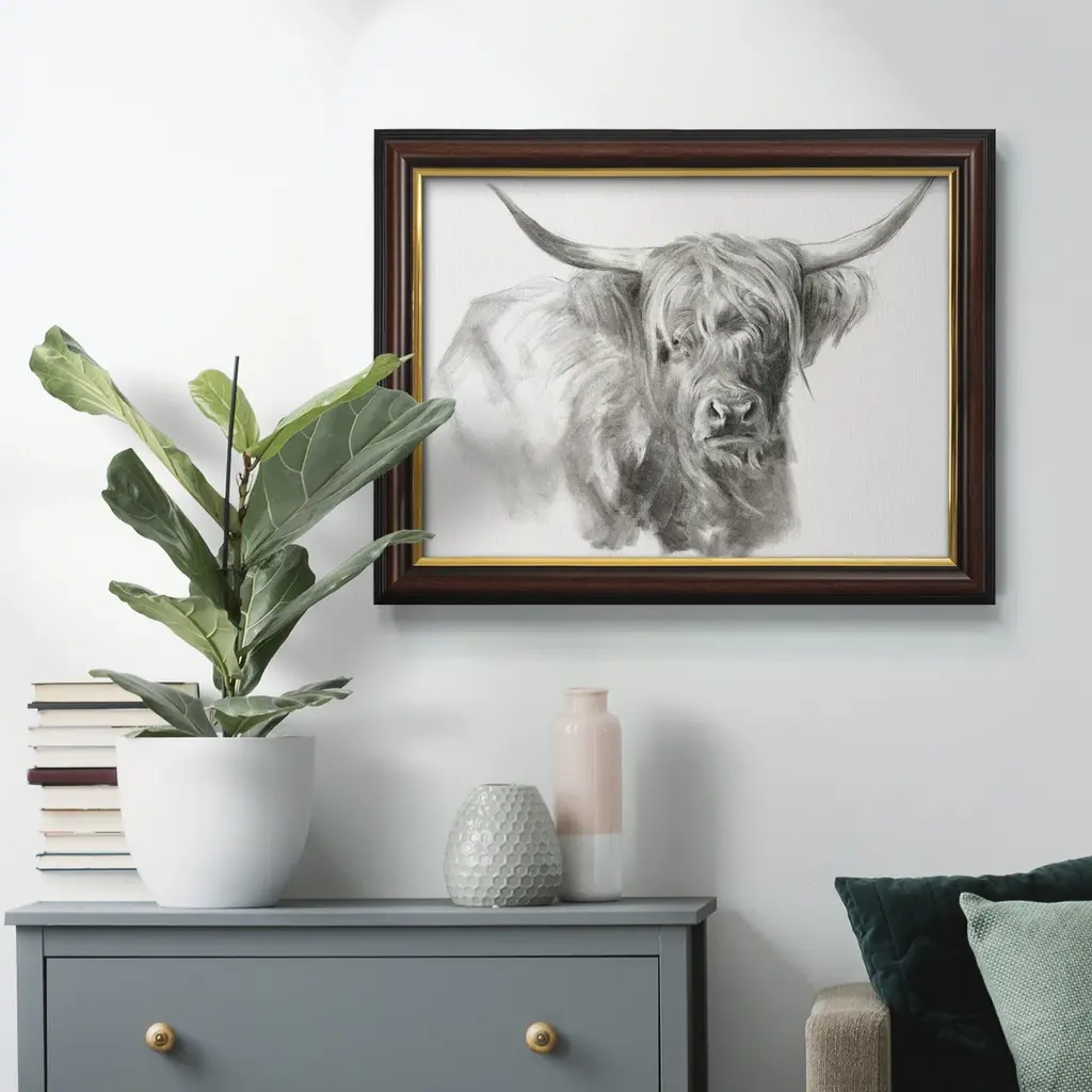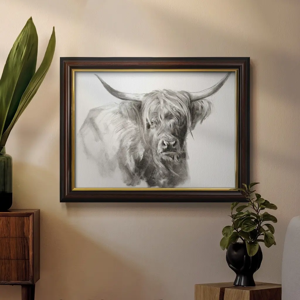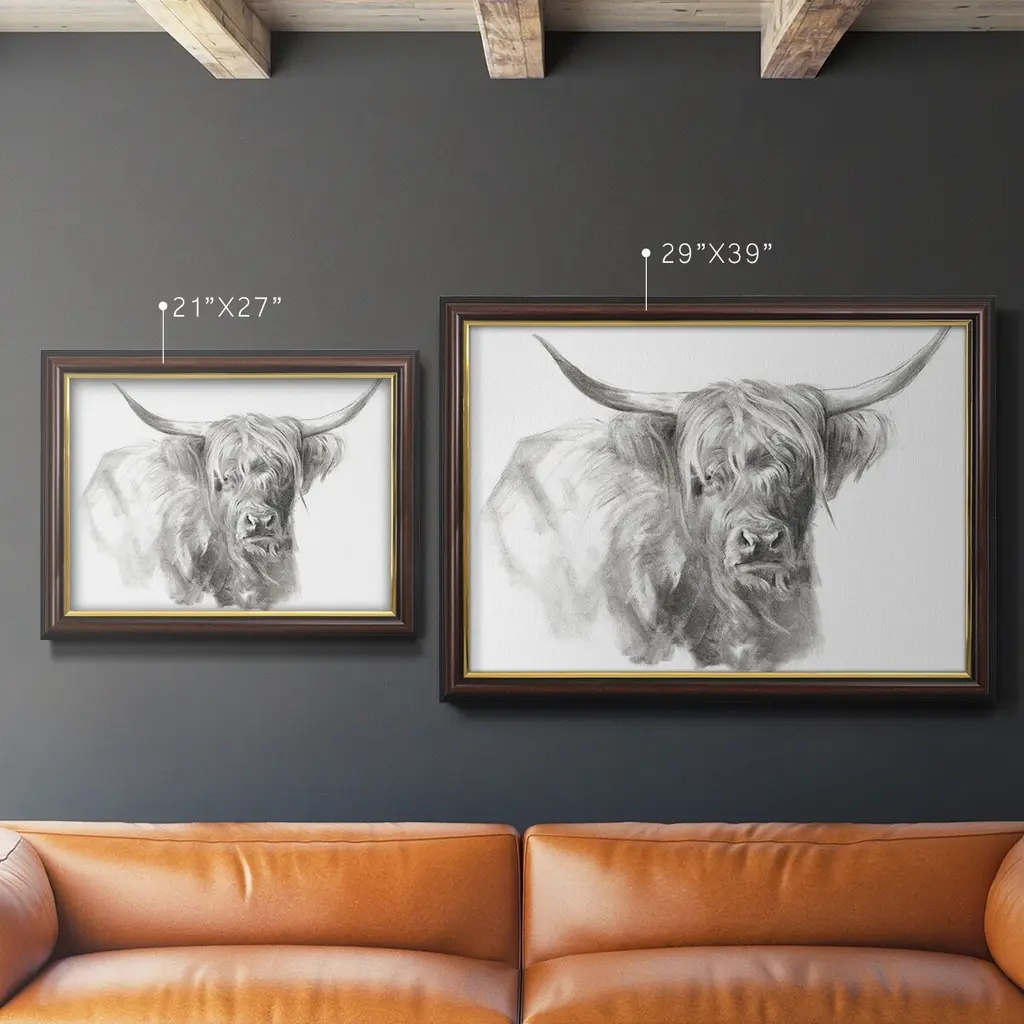 Soft Focus Highland Cattle I Premium Framed Canvas- Ready to Hang A Premium Framed Canvas created to last. Framed in distressed wood and available in an array of sizes and colors Featuring a beveled a solid wood stretcher bar, each piece comes ready to hand 3 SIZES AVAILABLE 16''X20'' - Overall Size 18'X27'' - Overall Size 24''x36'' - Overall Size Each piece is made to order. Each piece comes with hanging hardware. Made in the USA Ready to Hang Giclee Paper Print Acrylic Glass Beveled Matt Board