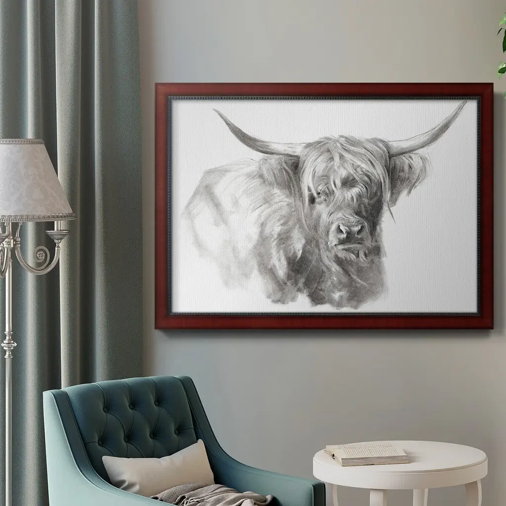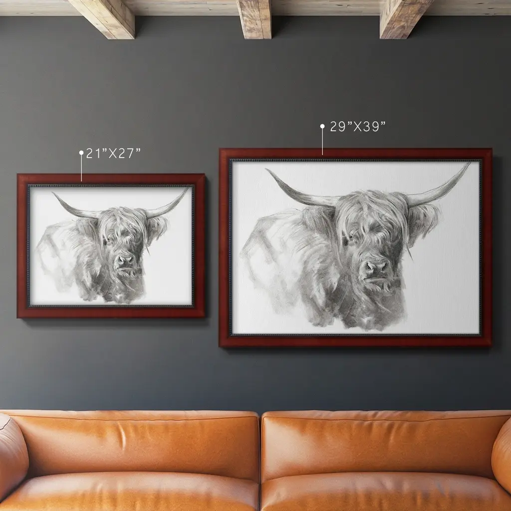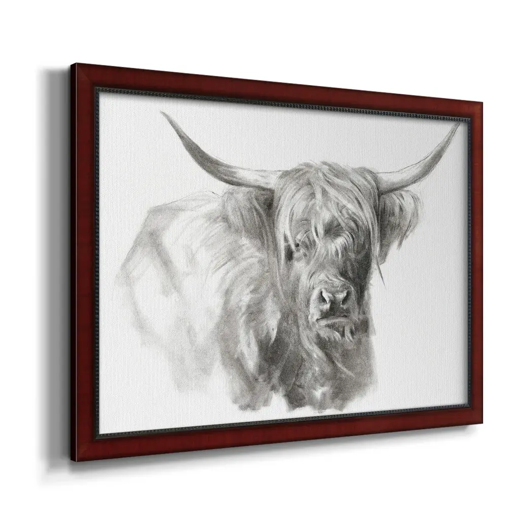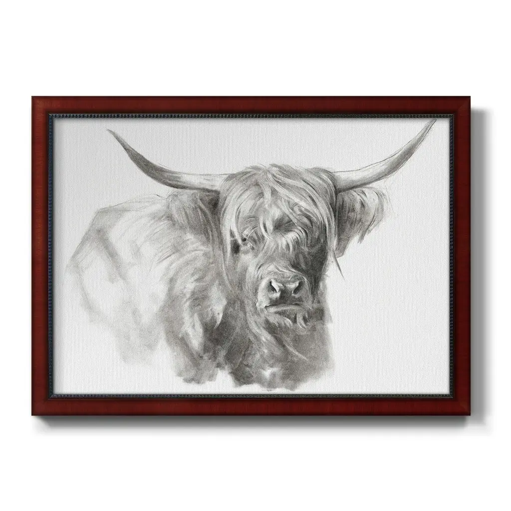 Soft Focus Highland Cattle I Premium Framed Canvas- Ready to Hang A Premium Framed Canvas created to last. Framed in distressed wood and available in an array of sizes and colors Featuring a beveled a solid wood stretcher bar, each piece comes ready to hand 3 SIZES AVAILABLE 16''X20'' - Overall Size 18'X27'' - Overall Size 24''x36'' - Overall Size Each piece is made to order. Each piece comes with hanging hardware. Made in the USA Ready to Hang Giclee Paper Print Acrylic Glass Beveled Matt Board