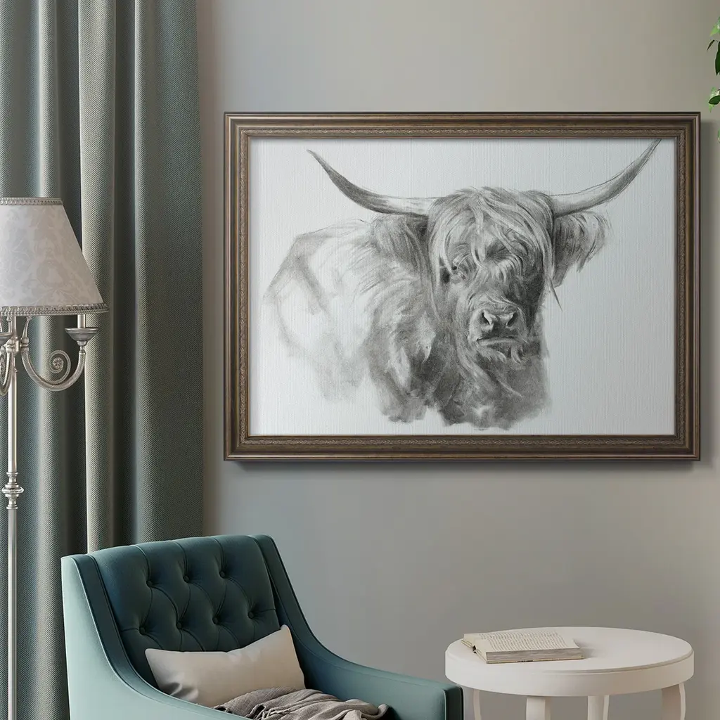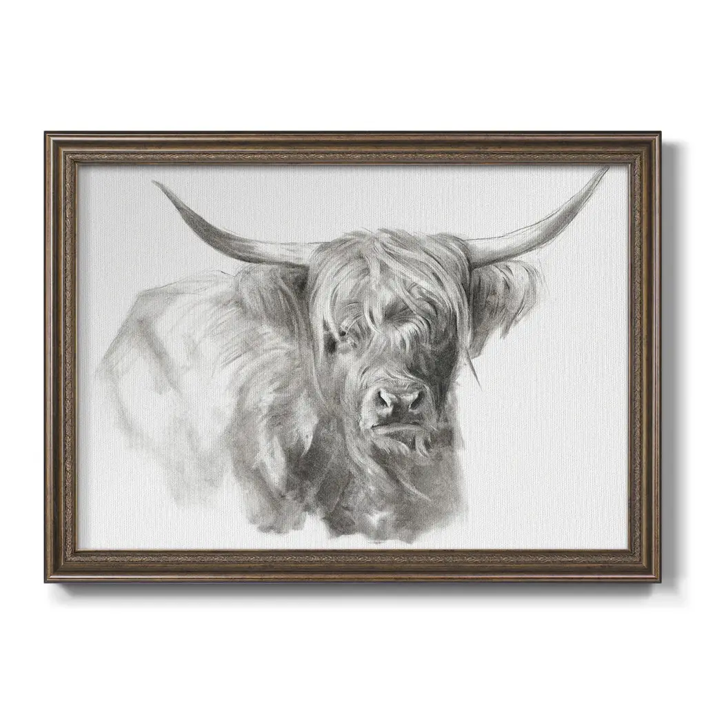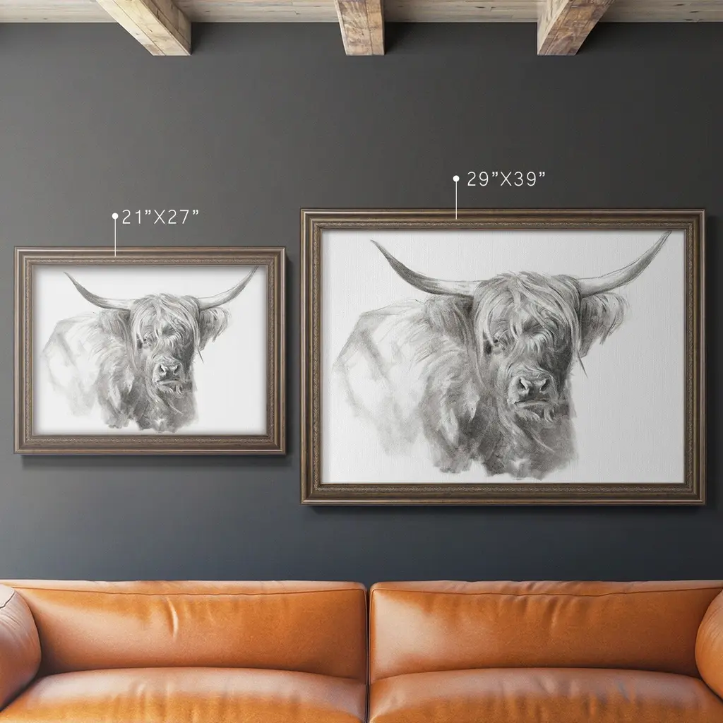 Soft Focus Highland Cattle I Premium Framed Canvas- Ready to Hang A Premium Framed Canvas created to last. Framed in distressed wood and available in an array of sizes and colors Featuring a beveled a solid wood stretcher bar, each piece comes ready to hand 3 SIZES AVAILABLE 16''X20'' - Overall Size 18'X27'' - Overall Size 24''x36'' - Overall Size Each piece is made to order. Each piece comes with hanging hardware. Made in the USA Ready to Hang Giclee Paper Print Acrylic Glass Beveled Matt Board