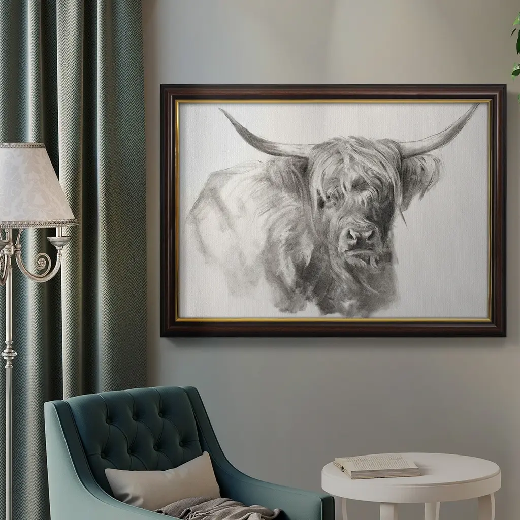 Soft Focus Highland Cattle I Premium Framed Canvas- Ready to Hang A Premium Framed Canvas created to last. Framed in distressed wood and available in an array of sizes and colors Featuring a beveled a solid wood stretcher bar, each piece comes ready to hand 3 SIZES AVAILABLE 16''X20'' - Overall Size 18'X27'' - Overall Size 24''x36'' - Overall Size Each piece is made to order. Each piece comes with hanging hardware. Made in the USA Ready to Hang Giclee Paper Print Acrylic Glass Beveled Matt Board