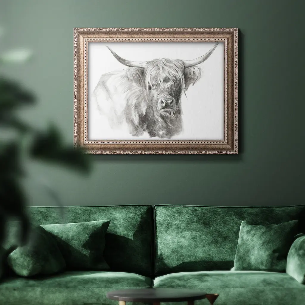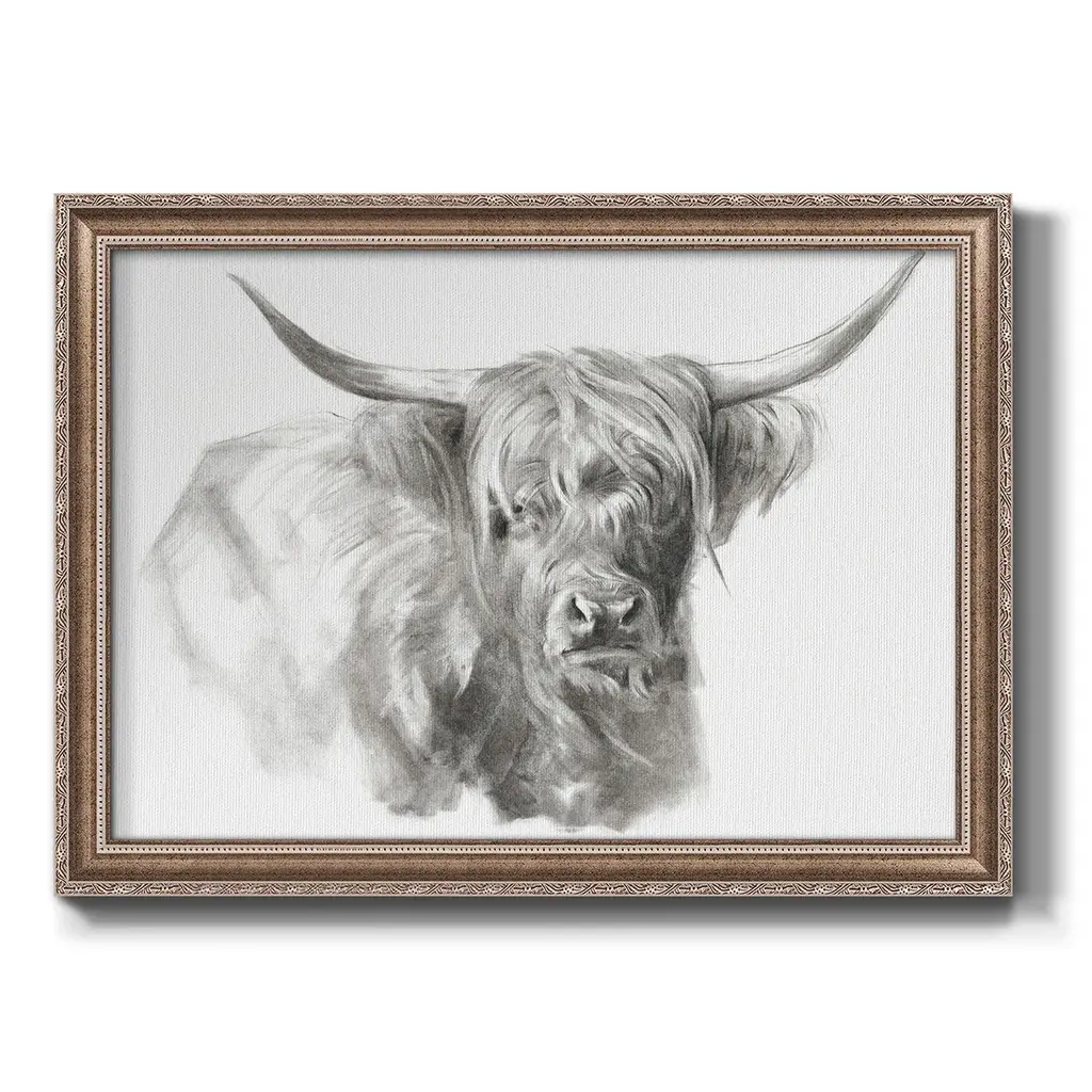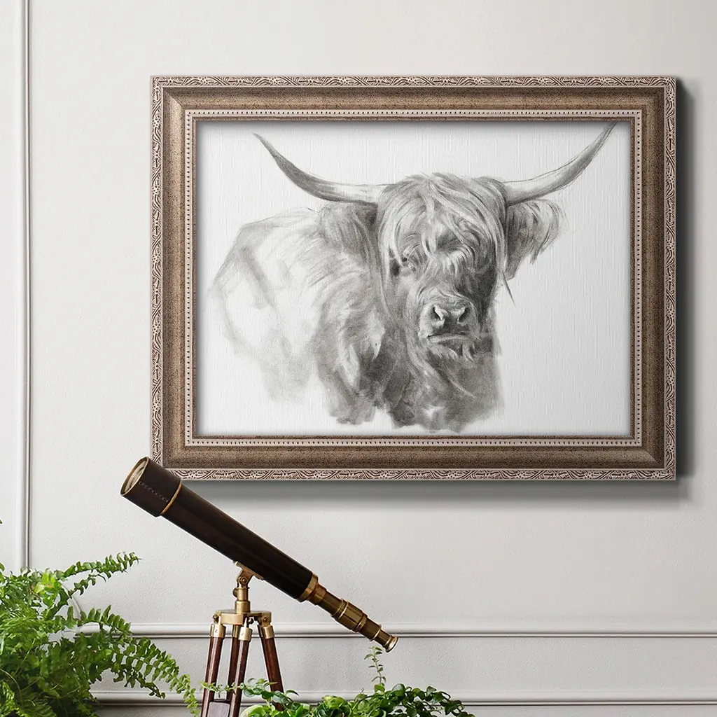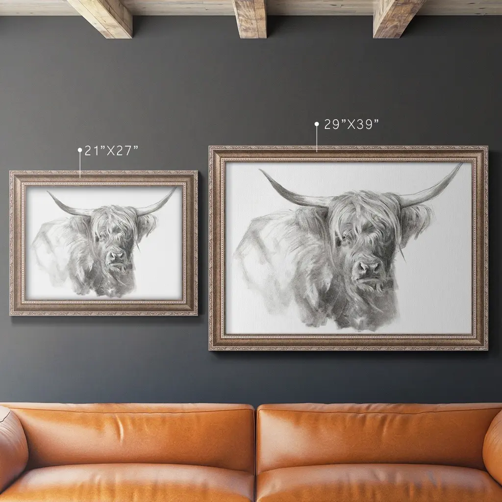 Soft Focus Highland Cattle I Premium Framed Canvas- Ready to Hang A Premium Framed Canvas created to last. Framed in distressed wood and available in an array of sizes and colors Featuring a beveled a solid wood stretcher bar, each piece comes ready to hand 3 SIZES AVAILABLE 16''X20'' - Overall Size 18'X27'' - Overall Size 24''x36'' - Overall Size Each piece is made to order. Each piece comes with hanging hardware. Made in the USA Ready to Hang Giclee Paper Print Acrylic Glass Beveled Matt Board