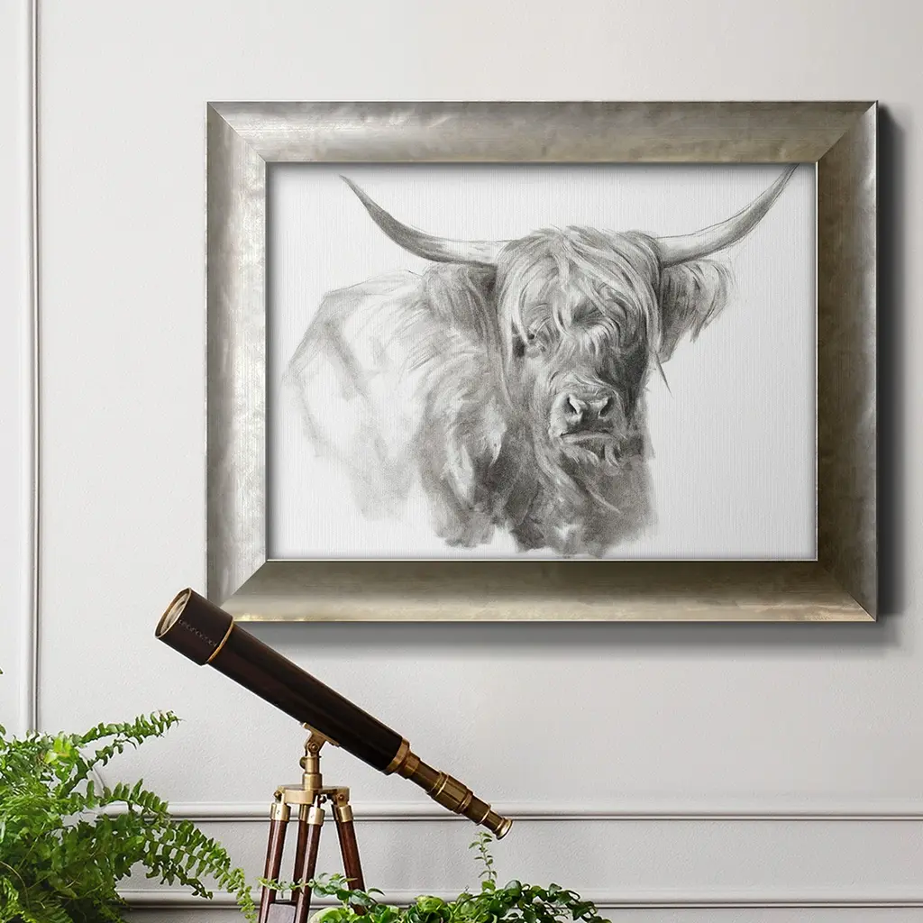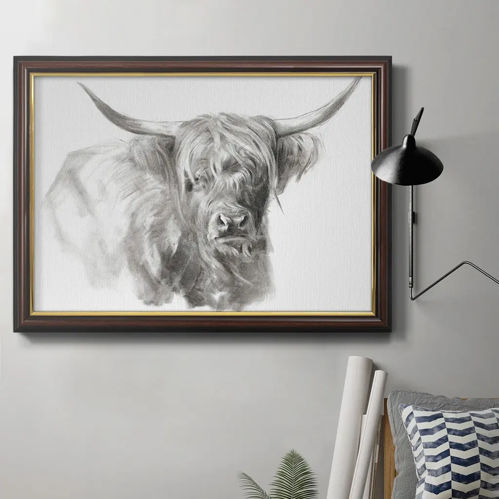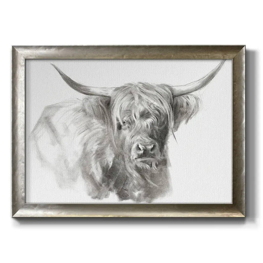 Soft Focus Highland Cattle I Premium Framed Canvas- Ready to Hang A Premium Framed Canvas created to last. Framed in distressed wood and available in an array of sizes and colors Featuring a beveled a solid wood stretcher bar, each piece comes ready to hand 3 SIZES AVAILABLE 16''X20'' - Overall Size 18'X27'' - Overall Size 24''x36'' - Overall Size Each piece is made to order. Each piece comes with hanging hardware. Made in the USA Ready to Hang Giclee Paper Print Acrylic Glass Beveled Matt Board