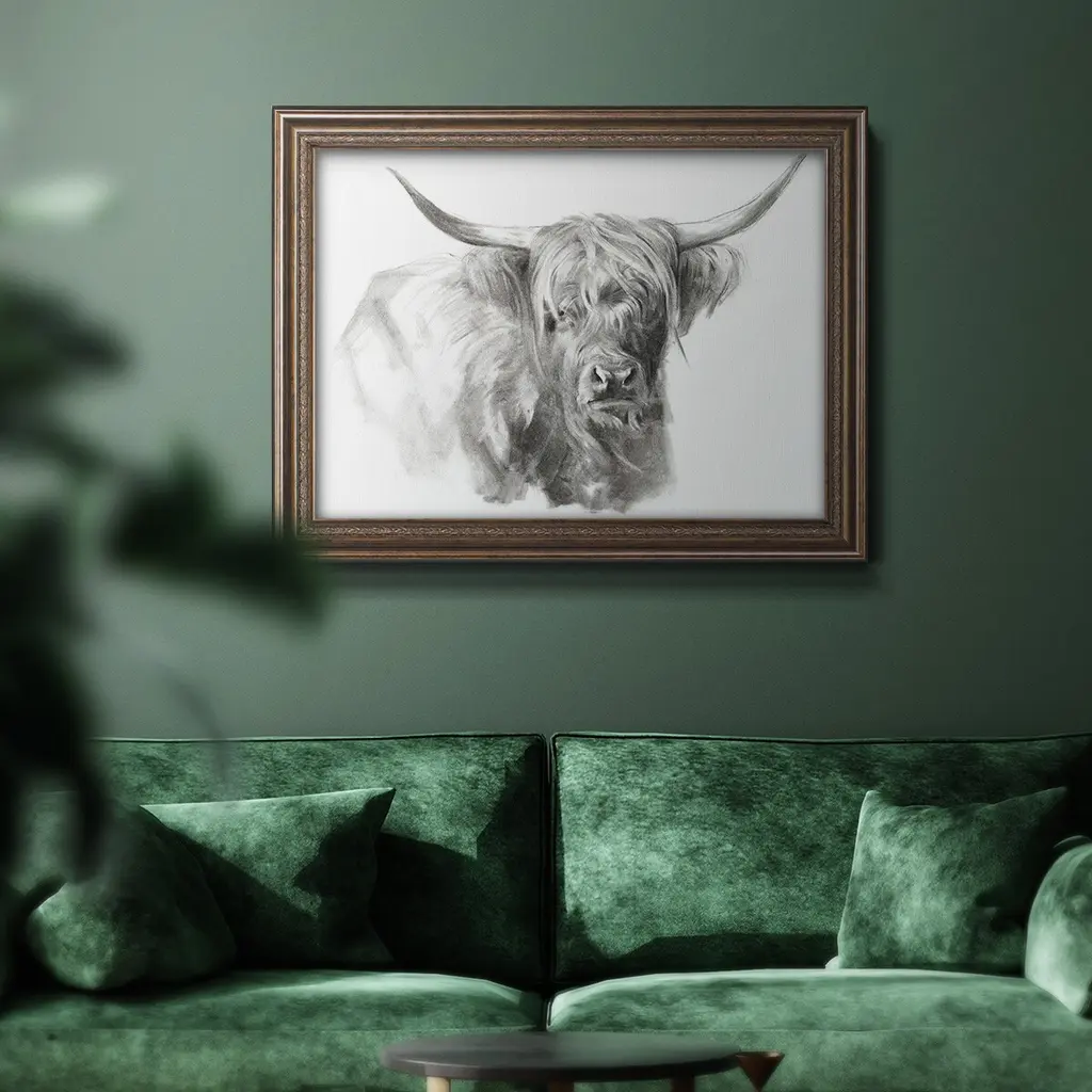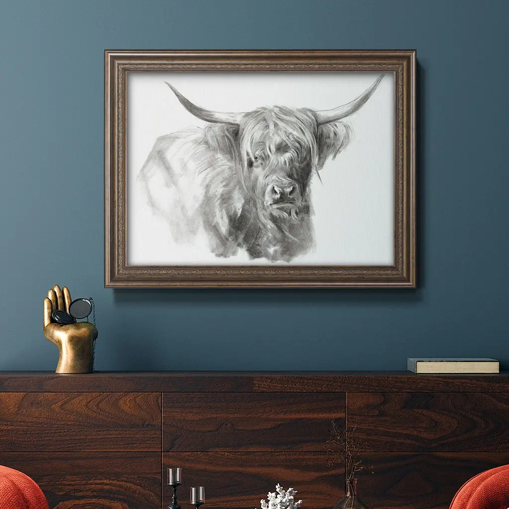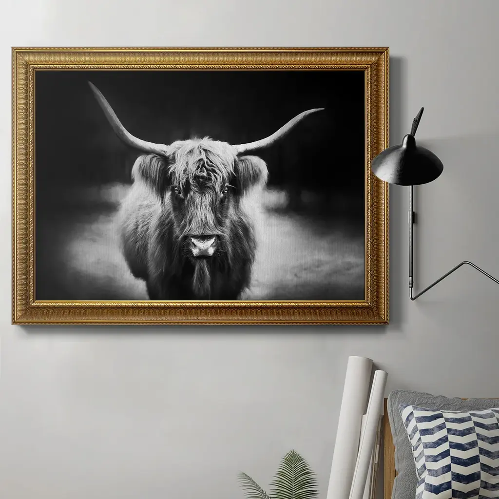 Soft Focus Highland Cattle I Premium Framed Canvas- Ready to Hang A Premium Framed Canvas created to last. Framed in distressed wood and available in an array of sizes and colors Featuring a beveled a solid wood stretcher bar, each piece comes ready to hand 3 SIZES AVAILABLE 16''X20'' - Overall Size 18'X27'' - Overall Size 24''x36'' - Overall Size Each piece is made to order. Each piece comes with hanging hardware. Made in the USA Ready to Hang Giclee Paper Print Acrylic Glass Beveled Matt Board