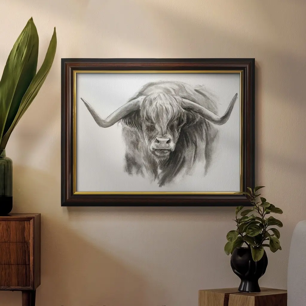 Soft Focus Highland Cattle II Premium Framed Canvas- Ready to Hang A Premium Framed Canvas created to last. Framed in distressed wood and available in an array of sizes and colors Featuring a beveled a solid wood stretcher bar, each piece comes ready to hand 3 SIZES AVAILABLE 16''X20'' - Overall Size 18'X27'' - Overall Size 24''x36'' - Overall Size Each piece is made to order. Each piece comes with hanging hardware. Made in the USA Ready to Hang Giclee Paper Print Acrylic Glass Beveled Matt Board