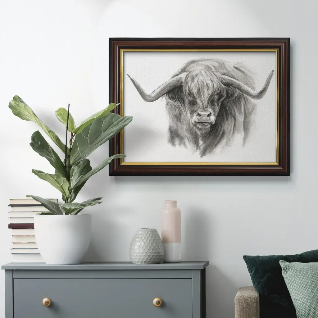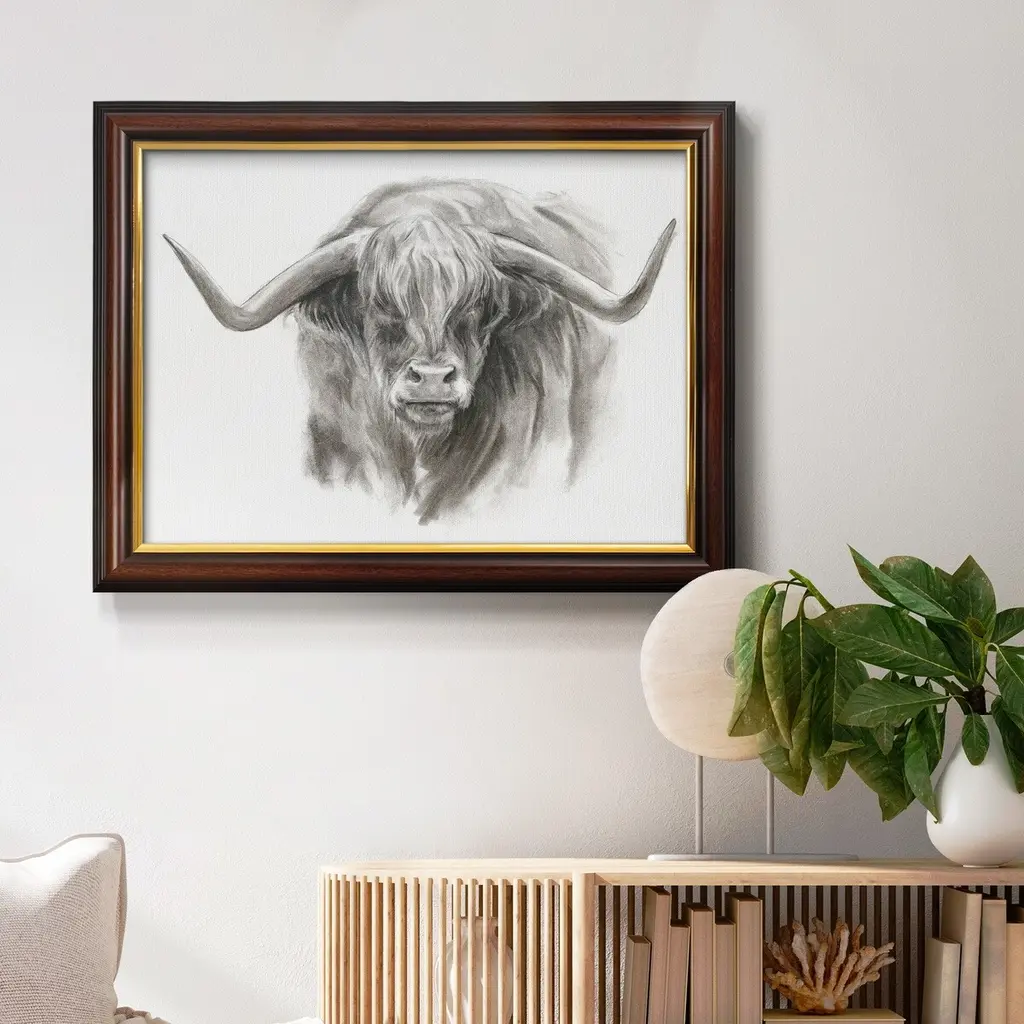 Soft Focus Highland Cattle II Premium Framed Canvas- Ready to Hang A Premium Framed Canvas created to last. Framed in distressed wood and available in an array of sizes and colors Featuring a beveled a solid wood stretcher bar, each piece comes ready to hand 3 SIZES AVAILABLE 16''X20'' - Overall Size 18'X27'' - Overall Size 24''x36'' - Overall Size Each piece is made to order. Each piece comes with hanging hardware. Made in the USA Ready to Hang Giclee Paper Print Acrylic Glass Beveled Matt Board
