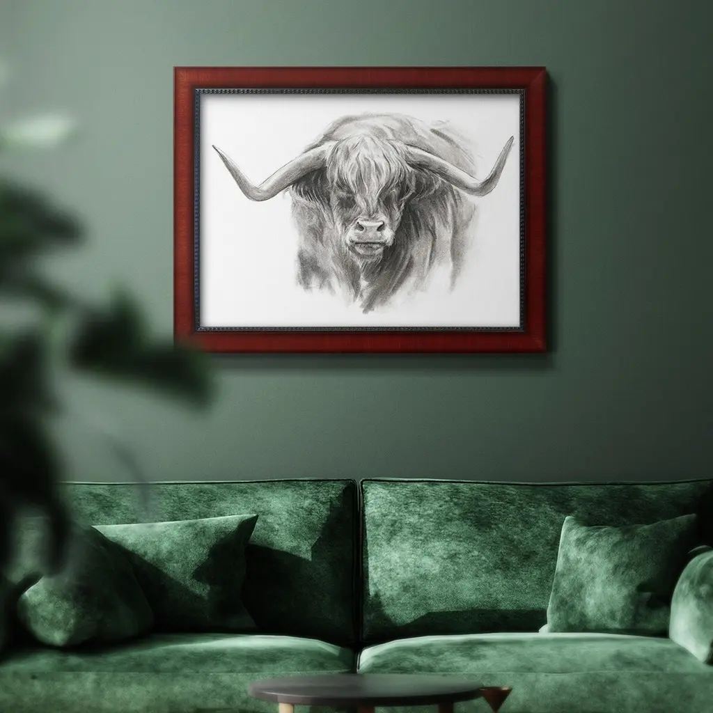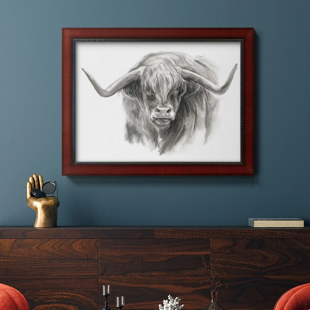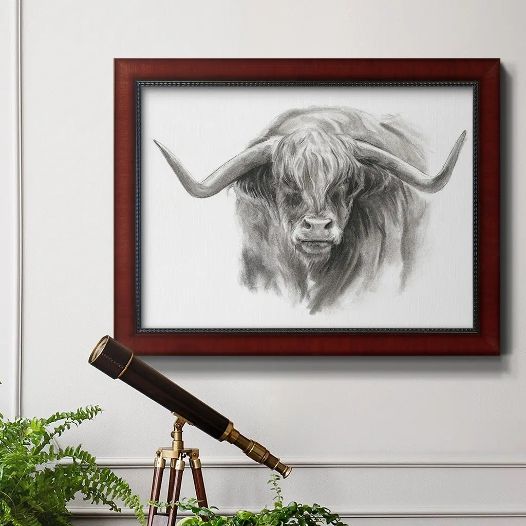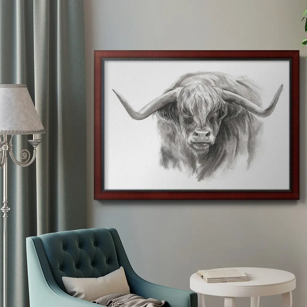 Soft Focus Highland Cattle II Premium Framed Canvas- Ready to Hang A Premium Framed Canvas created to last. Framed in distressed wood and available in an array of sizes and colors Featuring a beveled a solid wood stretcher bar, each piece comes ready to hand 3 SIZES AVAILABLE 16''X20'' - Overall Size 18'X27'' - Overall Size 24''x36'' - Overall Size Each piece is made to order. Each piece comes with hanging hardware. Made in the USA Ready to Hang Giclee Paper Print Acrylic Glass Beveled Matt Board