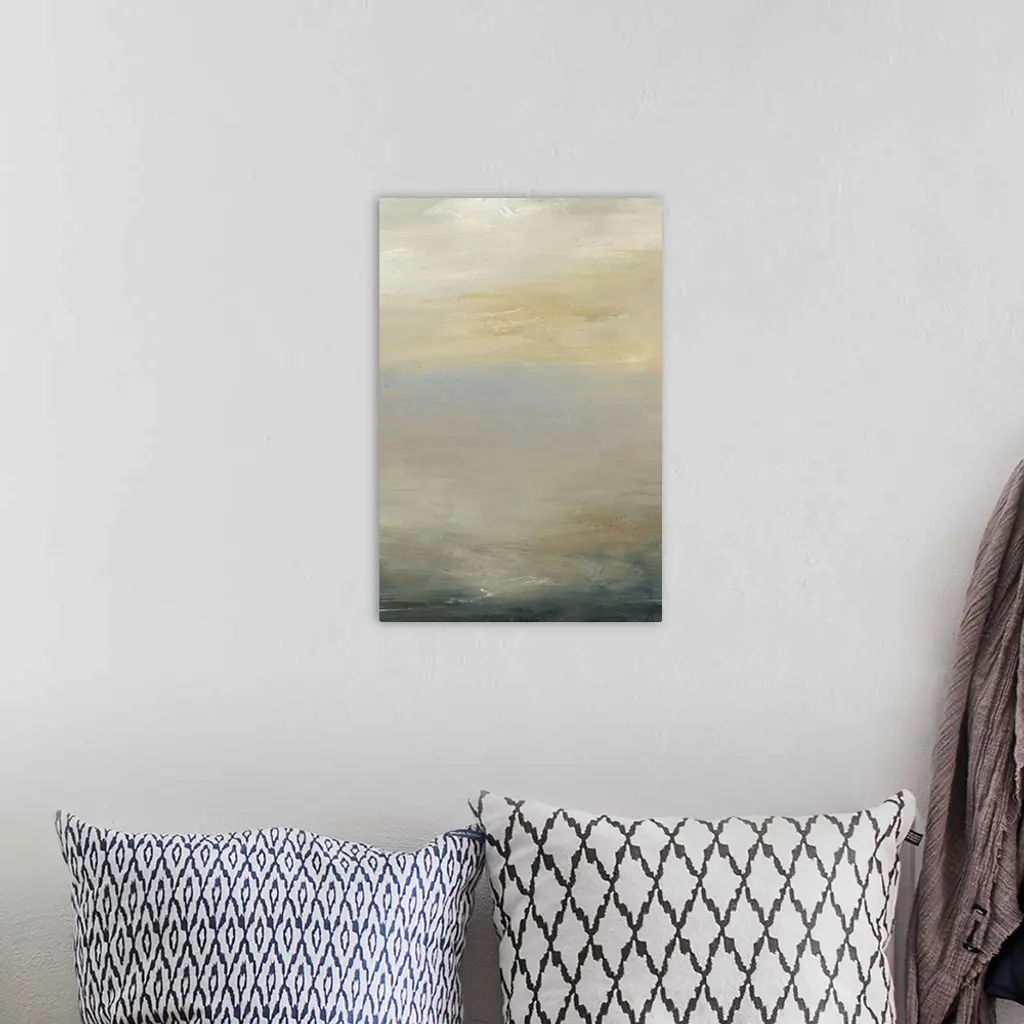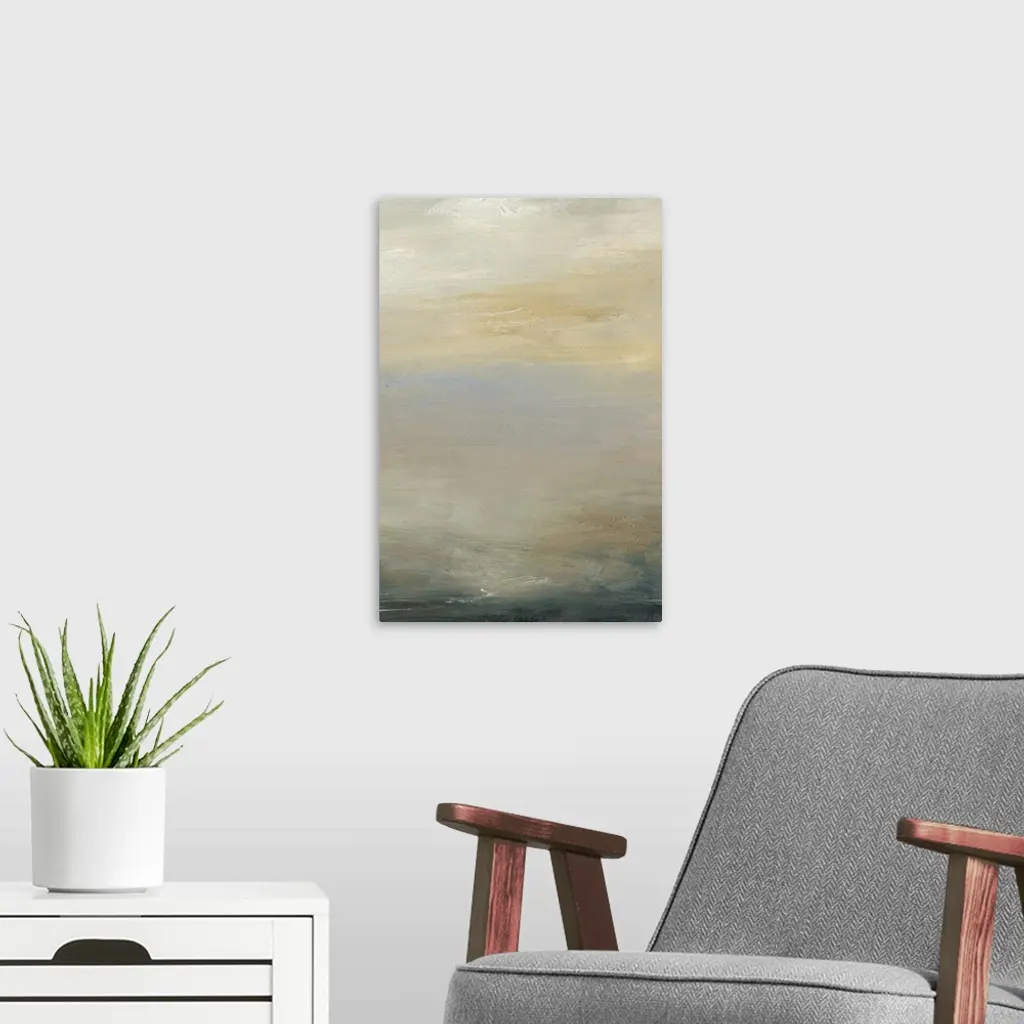 Contemporary landscape painting in soft, muted shades of tan and indigo.