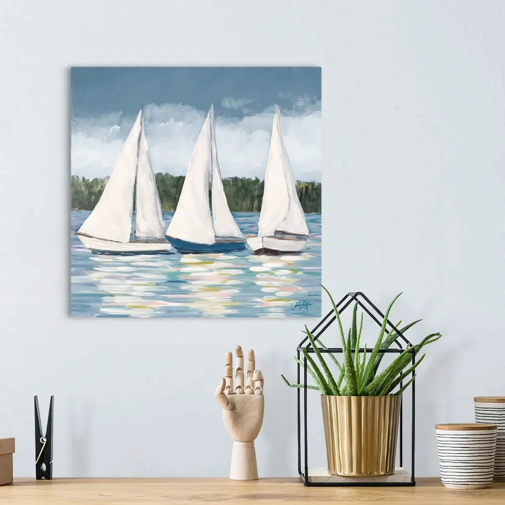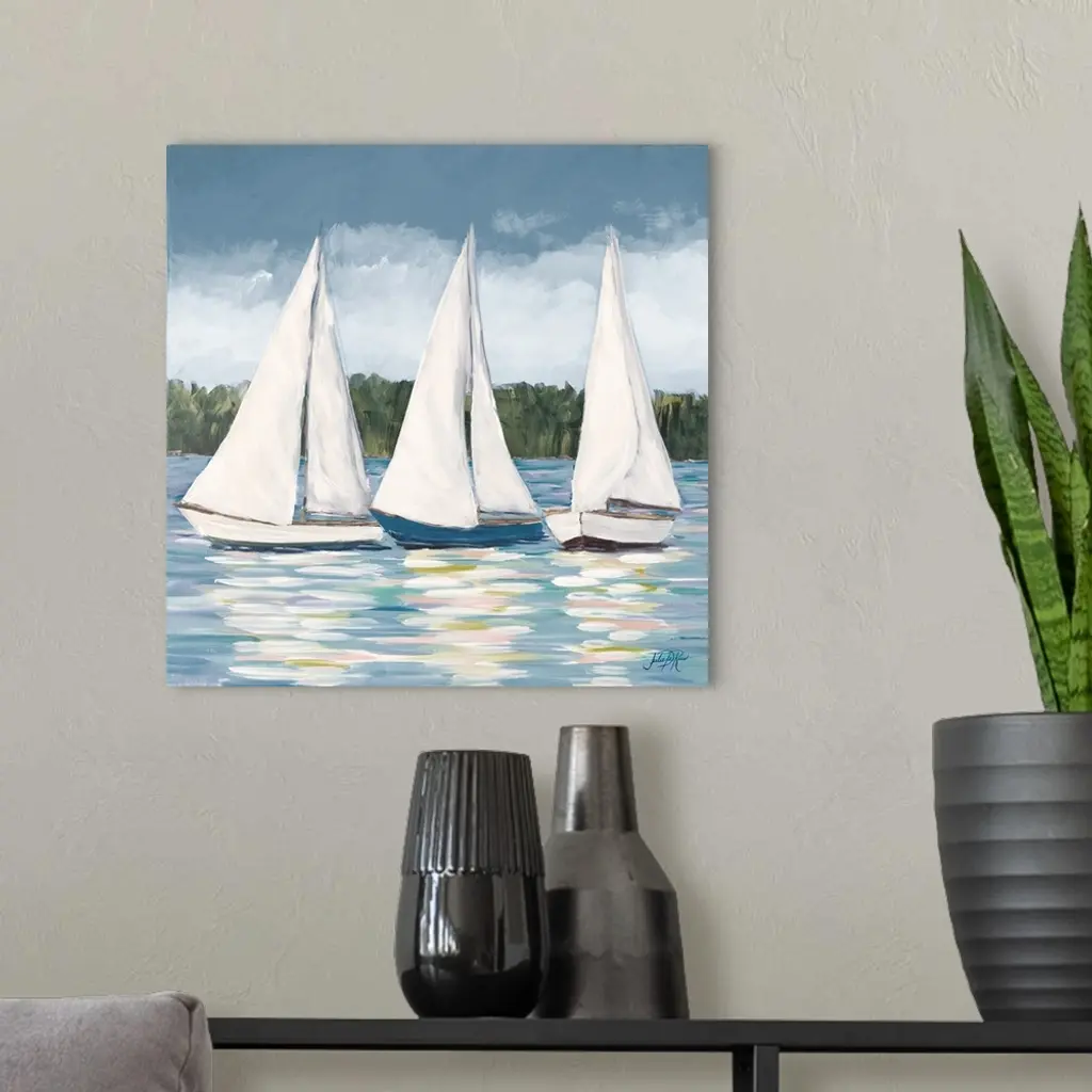 Bits of green and purple brush strokes dance playfully on the sea as two sailboats drift under an overcast day in this contemporary artwork.