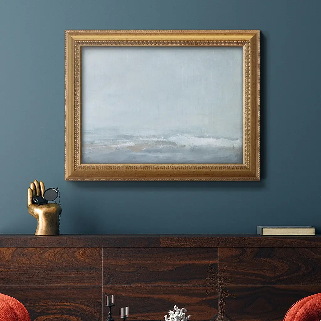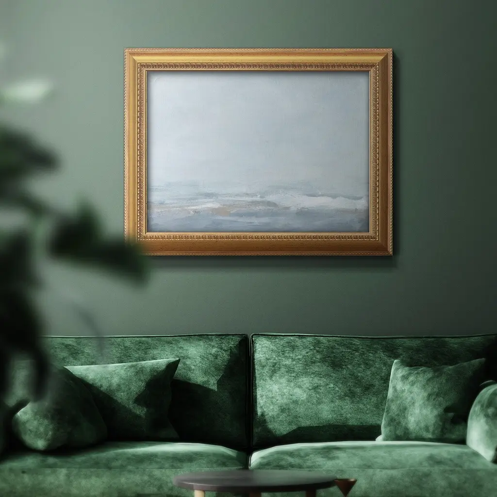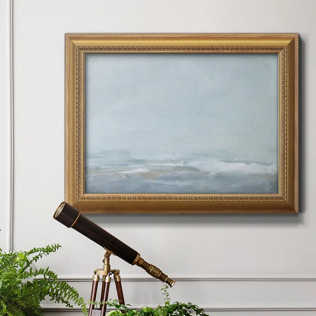 Soft Sea Mist II Premium Framed Canvas- Ready to Hang A Premium Framed Canvas created to last. Framed in distressed wood and available in an array of sizes and colors Featuring a beveled a solid wood stretcher bar, each piece comes ready to hand 3 SIZES AVAILABLE 16''X20'' - Overall Size 18'X27'' - Overall Size 24''x36'' - Overall Size Each piece is made to order. Each piece comes with hanging hardware. Made in the USA Ready to Hang Giclee Paper Print Acrylic Glass Beveled Matt Board