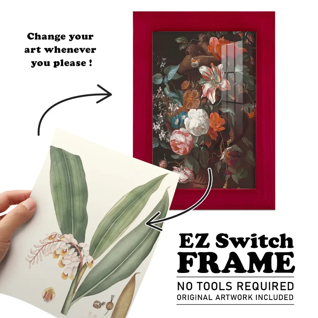 Soft Tropical II -EZ SWITCH Framed Print w/glass-Cherry Red A delightful, framed print. Featuring a solid wood frame with real wood glass. This premium print is giclee quality. In addition, every frame features a removable back and table top stand. This allows you to change your art in the future or to just stand the art on a table for a new look. We are sure you'll enjoy our new series of EZ SWITCH Framed Art. Solid Wood Frame Real Glass Removable / Replaceable Art Built in Tabletop Stand Sizes range from 4x6 up to 12x15 - buy just one or pair them up as sets as you see fit.
