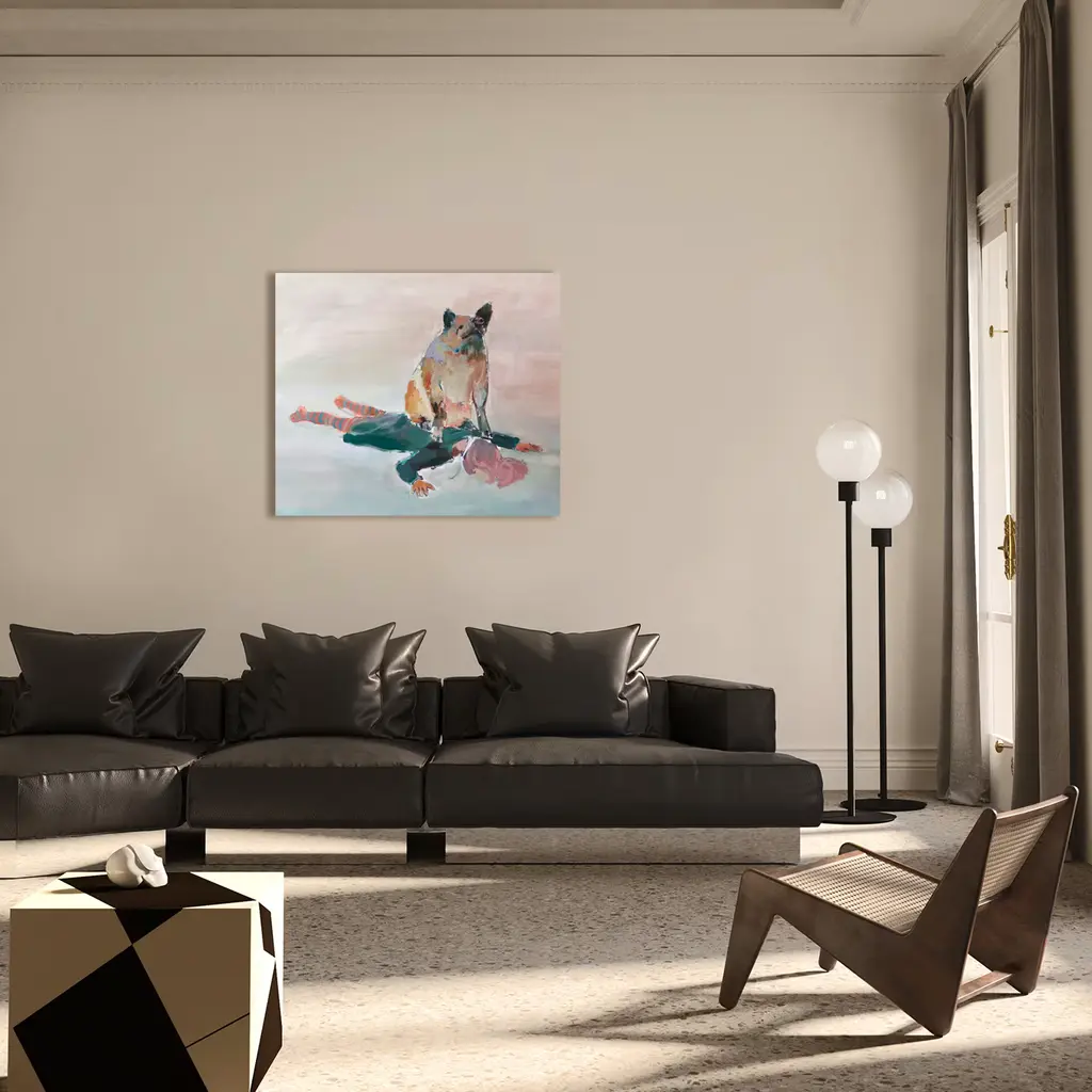 Named after the Italian words for "liquid dream", this magnificent painting explores the inner storms that often come with sleep. Exuding heaviness and a harsh sense of paralysis, it brings to life helpless and solitary emotions enhanced with delicate and dark shades, enhancing the depicted scene of an animal weighing down a little girl. Please consult the Concierge for further information. This is a unique piece of art. Delivered with a certificate of authenticity. Frame not included.