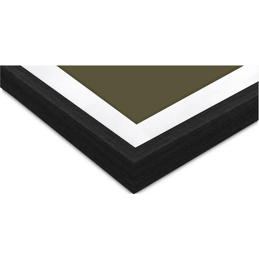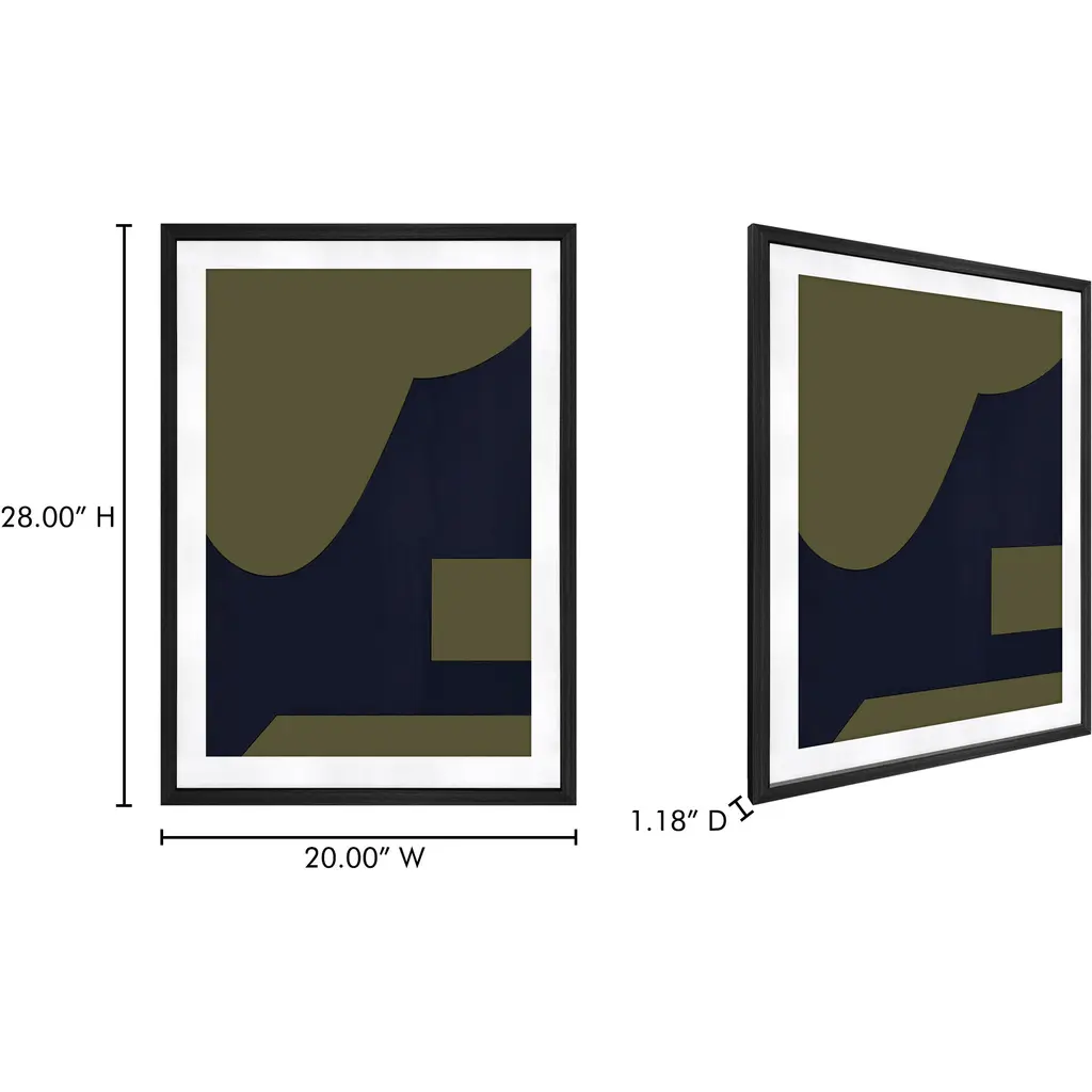 The Sola framed print is a serene confluence of vintage-inspired olive and navy tones, articulated through a contemporary abstract lens. Behind its tempered glass and encased in a solid pine frame with a sleek black finish, the print's subtle yet profound allure speaks volumes.