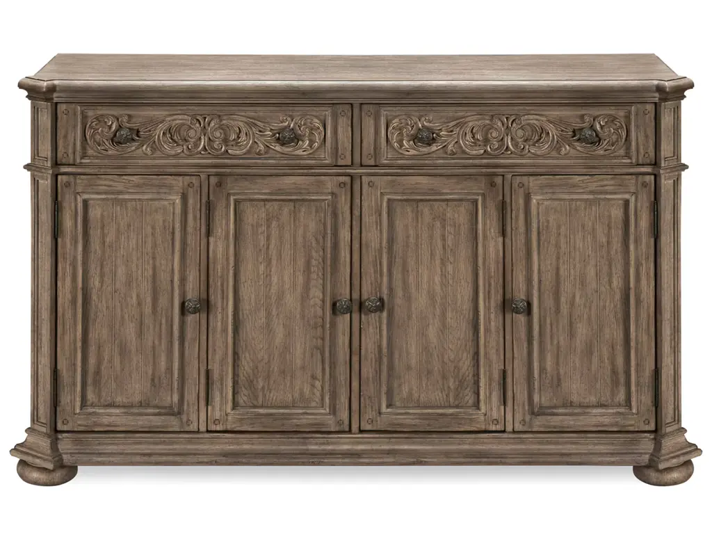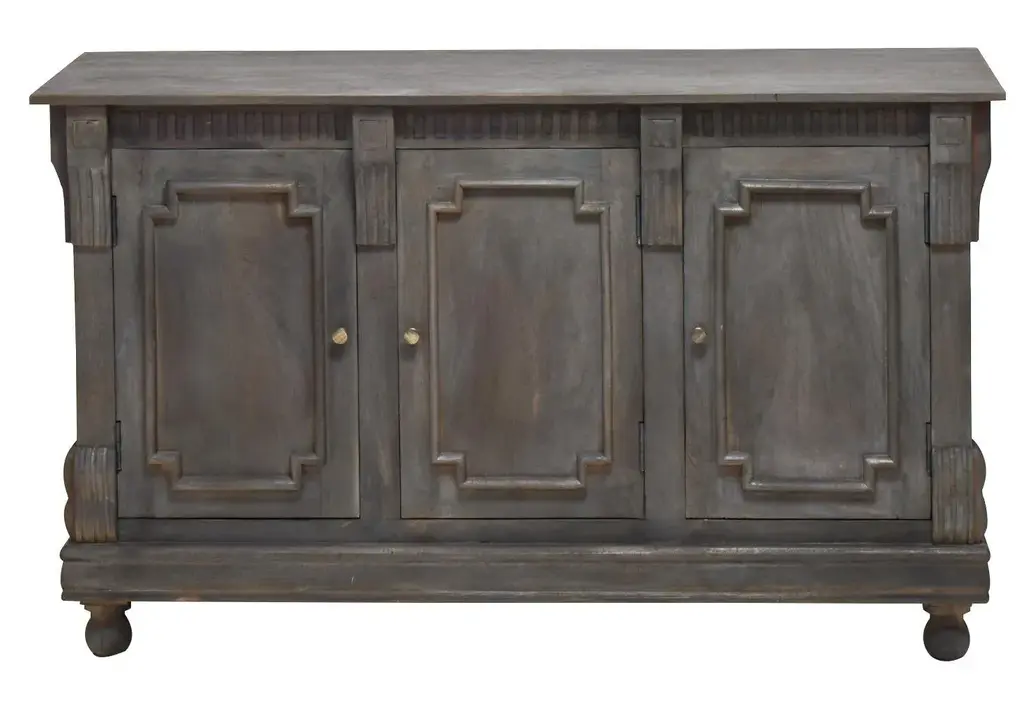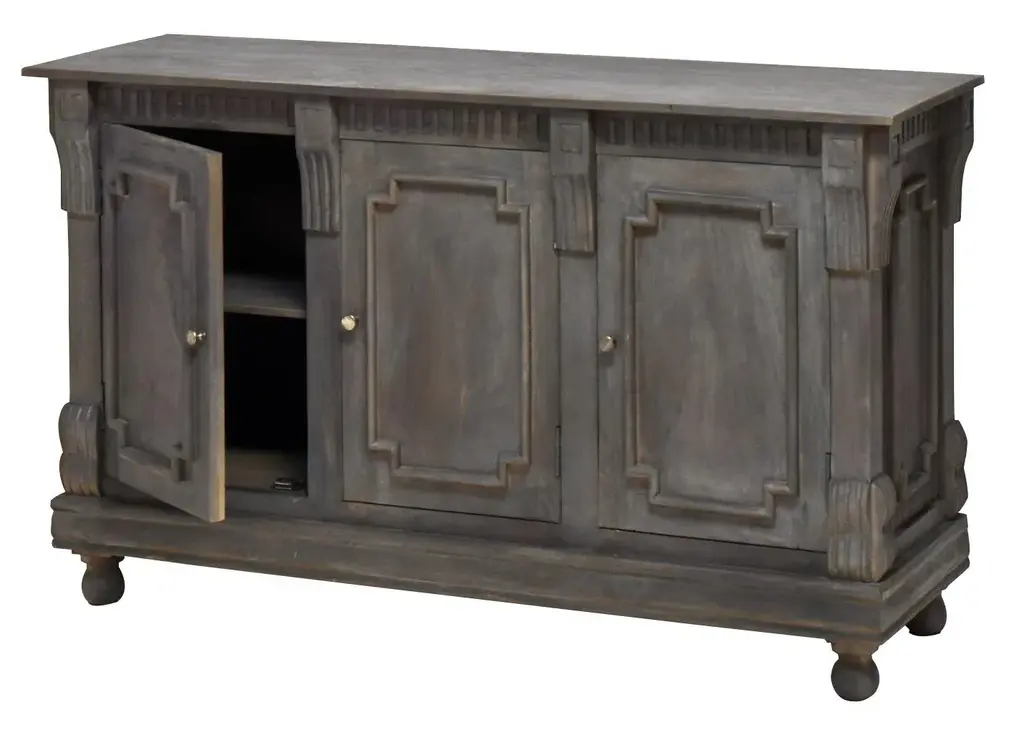 Bring a touch of elegance and luxury to your home with our exquisite 60" Solid Wood Dining Room 3 Door Sideboard. Artfully hand-crafted with intricate details, the mango timber and "Heathered Stone" finish exude sophistication. With a spacious shelved interior and ornate moldings, this breathtaking piece is a perfect addition to any room. Made from mango timber and finished with a water-resistant lacquer seal in "Heathered Stone", this wood sideboard boasts exquisite hand-chiseling and carving, intricate applied moldings and shaped column sections, stacked bases, and capped ball feet. Elevate your hallway or living room with this stunning sideboard. Its spacious shelved interior, classic design, and superior craftsmanship make it a beautiful and functional addition to your home. Experience the ultimate in elegance and refinement with this exceptional solid wood sideboard, featuring hand-chiseled and carved details and decorative moldings. 60" Solid Wood Dining Room 3 Door Sideboard Distressed Gray Features: Materials: Mango wood Assembly Required: No Category: Buffets And Sideboards Style: Traditional Dimensions: 36 x 60 x 20 Please Note: The grain, texture and tone of this hand crafted furniture will vary from piece to piece. The wood's natural characteristics such as knots, grain patterns, cracks, and color variations enhance the unique handmade appearance. In certain climates, these woods may expand and contract developing slight splits or cracks. But these small imperfections are natural and will not compromise the structural integrity of your piece. Since each piece is hand made, each piece will be unique and beautiful in its own way. Our furniture collection features time-honored techniques and top-quality materials. Each piece tells a story of tradition and modernity, starring globally inspired practices and unsurpassed craftsmanship. Our intensive process begins with freehand drawings carefully sketched onto wood. Although each piece of naturally sourced material is inspected to ensure quality and color, none is exactly alike, so every console, table, or nightstand you bring home is truly one of a kind